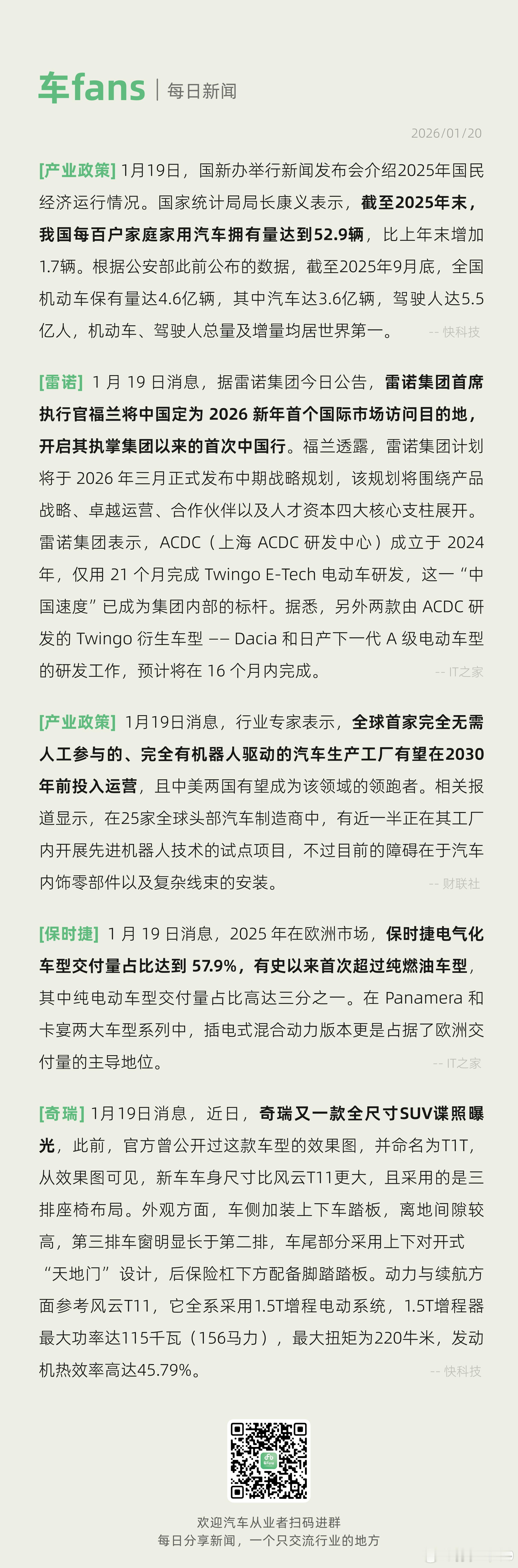 我国每百户家庭家用汽车拥有量达到52.9辆、雷诺首席执行官福兰将中国定为2026新年首个国际市场访问目的地据雷诺集团今日公告,雷诺集团首席执行官福兰将中国定为2026新年首个国际市场访问目的地,开启其执掌集团以来的首次中国行。福兰透露,雷诺集团计划将于2026年三月正式发布中期战略规划,该规划将围绕产品战略、卓越运营、合作伙伴以及人才资本四大核心支柱展开。雷诺集团表示,ACDC(上海ACDC研发中心)成立于2024年,仅用21个月完成TwingoE-Tech电动车研发,这一"中国速度"已成为集团内部的标杆。据悉,另外两款由ACDC研发的Twingo衍生车型--Dacia和日产下一代A级电动车型的研发工作,预计将在16个月内完成。其他家在中国投入得如火如荼,雷诺肯定要来中国拜码头了新能源汽车