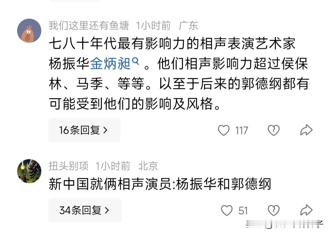 看到有网友说:新中国就俩相声演员——杨振华和郭德纲! 就赶紧去科普一下,说实话,对杨振华老先生并不太熟悉,看完简介,用著名相声表演艺术家来形容,丝毫不为过,2017年还收了13位弟子,85岁高龄时还在演出,这是真的热爱相声事业。 还有网友说,老先生算是七八十年代最有影响力的相声大师,甚至超过了侯宝林、马季等,郭德纲的表演风格可能都受到他们的影响。 如此看来,对于相声爱好者来说,老先生的名字如雷贯耳,在圈中享有很高的地位。 老先生曾说,要为沈阳相声“传帮带”,也算桃李满天下,做出很大的贡献。 据媒体报道,杨振华老先生安详离世,享年90岁,让人悲痛和惋惜。 愿逝者安息,一路走好!