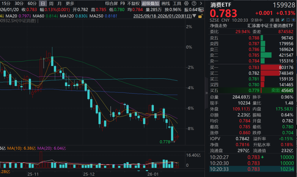 今日(1.20),港股消费飘红,港股通消费50ETF(159268)放量涨超2%。权重股多数飘红,泡泡玛特涨超9%,海尔智家、李宁、蒙牛乳业、华润啤酒、老铺黄金涨超1%(标的指数成分股仅做展示,不作为个股推介)。