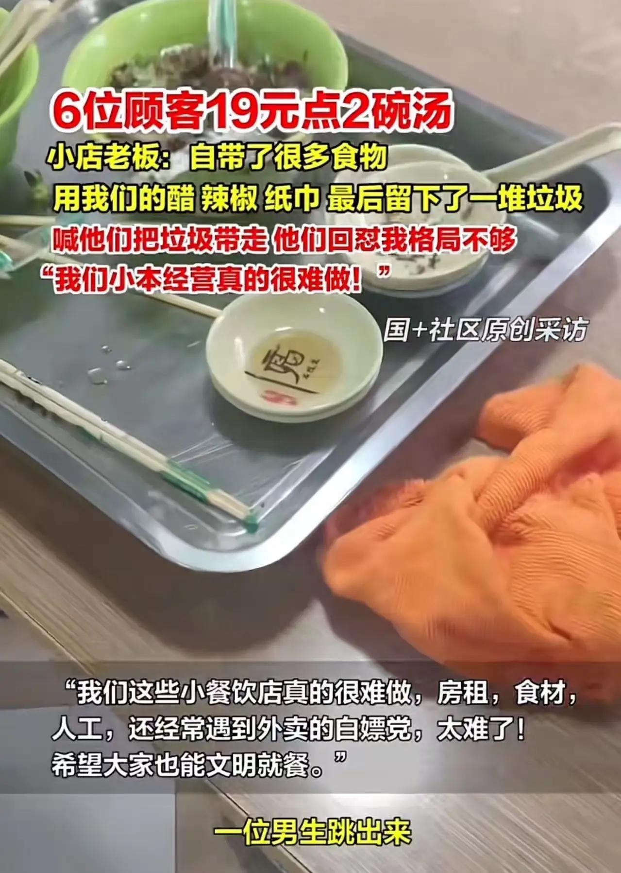 上海icon,6位顾客自带食物去餐馆吃饭,只花19元点2碗汤,用店里的醋、辣椒、纸巾,最后留下一堆垃圾。老板喊他们把垃圾带走,顾客回怼:“你这格局做什么生意!”老板:“我们小本经营真的很难!” 这段对话反映了餐馆与顾客之间的矛盾,涉及到经营理念、服务态度以及双方的期待。以下是对情境的分析与看法: 顾客的行为: 自带食物:通常餐馆会鼓励顾客点餐,自己带食物可能影响餐馆的正常运营和卫生环境。 只花19元点了两碗汤,可能觉得价格便宜,追求性价比,但也表现出对餐馆规则的忽视。 留下一堆垃圾:没有主动清理,增加了餐馆的清洁负担。 反问“你这格局做什么生意”,显示出对餐馆经营方式的不满或轻视。 店家的反应: 要求顾客带走垃圾,维护环境整洁。 表示“我们小本经营真的很难”,反映出经营压力大,可能希望得到理解和尊重。 文化与经营理念: 这反映出一些小型餐馆在面对“自带食物”或“破坏环境”的行为时,可能会感到无奈。 顾客可能没有意识到他们的行为给店家带来的困扰。 店家希望顾客尊重经营规则,保持良好的用餐环境。 建议: 顾客应理解餐馆的经营难处,遵守规则,合理用餐。 餐馆也可以明确标示“禁止自带食物”或“用餐后请自行清理”,以减少冲突。 双方应以沟通和理解为基础,建立良好的用餐体验。 总结: 这段对话折射出小型餐馆在经营中的一些常见矛盾,也提醒我们在公共场合要尊重规则,理解经营者的难处,同时餐馆也应加强管理,营造和谐的用餐环境。