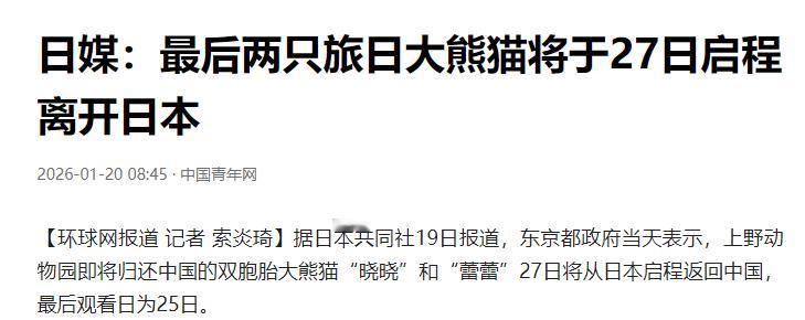 快讯! 日本东京都政府突然宣布了 日本共同社1月19日消息,东京都政府19日表示,将归还中国的上野动物园双胞胎大熊猫27日从日本启程。最后观看日为25日。 这对即将回国的双胞胎大熊猫,有个寓意超美的名字,哥哥叫晓晓,妹妹叫蕾蕾。它们2021年6月23日出生在上野动物园,父母是旅日大熊猫比力和仙女,也就是日本民众熟知的力力和真真。 消息一出,日本的熊猫迷彻底绷不住了。从上野动物园近期的客流就能看出,大家都在抓紧最后的时间和这对小可爱告别。 为了控制人流,上野动物园早就调整了参观规则。从2025年12月23日开始,游客就得网上预约才能入园,每天名额限制在4000人左右。 到了1月14日至25日这个最后阶段,参观方式直接改成了预约抽签制。竞争激烈到什么程度?不少常年打卡的熊猫迷都没能中签,只能在社交平台发文表达遗憾。 有位叫高氏贵博的日本网友,本职是网页设计,自2011年迷上熊猫后,除了特殊情况几乎天天泡在上野动物园。他的镜头记录了晓晓和蕾蕾从出生到长大的全过程,对他来说,这对双胞胎早已像家人一样。 高氏贵博坦言,早就知道它们会按约定回国,但真到了离别的时候,心里的难过还是止不住地往上涌。 不光是他,很多日本民众都特意从外地赶来。寒冬腊月里,动物园门口天天排着长队,有人甚至要等5个小时,只为换来一分钟的见面时间。 大家之所以这么舍不得,不光是因为晓晓和蕾蕾可爱。这对双胞胎承载了太多人的青春和回忆,它们的成长轨迹,也是中日民间友好的见证。 可能有人会问,为什么一定要现在送回国?核心原因就是租借协议到期了。按照中日双方的约定,所有租借的大熊猫及其后代都归中国所有,租约期满后必须归还中方。 东京都政府其实早就提出了续租申请,还希望能新租一对大熊猫。但截至目前,中方并没有同意这份申请。 这背后,和近期中日关系的紧张态势有直接关联。日本首相高市早苗此前发表的涉台言论,引发了中方的强烈反对。相关人士透露,在这种大背景下,新的熊猫租借几乎没有实现的可能。 晓晓和蕾蕾回国后,日本国内将彻底没有大熊猫。这是自1972年中日邦交正常化以来,日本首次面临这样的情况。 回溯历史,熊猫一直是中日友好的重要纽带。1972年,中国首次向日本赠送大熊猫康康和兰兰,当年上野动物园的入场人数直接创下纪录,熊猫热从此在日本扎根。 之后的几十年里,不管是香香,还是如今的晓晓和蕾蕾,每一只旅日熊猫都成了全民追捧的明星。它们的存在,悄悄拉近了两国民众的距离,让更多日本人了解并喜欢上中国。 目前,上野动物园正在全力做好晓晓和蕾蕾的回国准备。工作人员会提前检查运输设备,还会准备它们爱吃的竹子和苹果,确保旅途安全舒适。 1月25日之后,日本民众再想看到大熊猫,可能就得专程来中国了。这对承载了半个多世纪友好记忆的“使者”,即将结束旅日旅程,回到祖国的怀抱。
