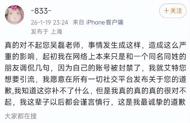 网友白珊珊于1月19日晚发布道歉声明,称此前言论是与“同名同姓朋友”的调侃,承认此前针对演员吴磊的指控(包括所谓“欠债”“床照”等言论)实为引流炒作,并承诺“谨言慎行”: