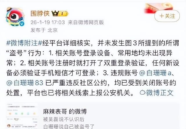 据悉,网友白珊珊在未道歉之前、事件发酵后,曾称自己被盗号,但微博方经核实表示,并未发生所提到的所谓“盗号”行为:因相关账号登录设备与常用地无异常、注册时开启双重登录验证需新设备短信验证方可登录,且违规账号@白珊珊a、@白珊珊83严重违反社区公约已被关闭账号,平台亦将相关线索上报公安机关。