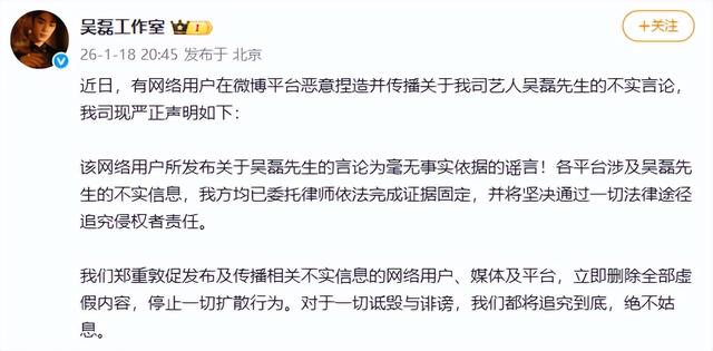 1月18日,一网友称有艺人床照,并喊话吴磊:“吴磊你欠我的拿什么还”,引发相关话题的热议。演员吴磊工作室官方微博发布声明称相关言论不实。