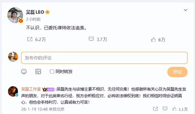 1月19日,演员吴磊通过个人微博账号@吴磊LEO回应:“不认识,已委托律师依法追责。”随后,吴磊工作室转评:“吴磊先生与该博主素不相识,无任何交集!也感谢所有关心及为吴磊先生发声的朋友,对于此类卑劣行径,我方会积极应对,必将依法维权到底!我们相信时间会证明真心,但也会手持利刃,让真诚有力可言!”