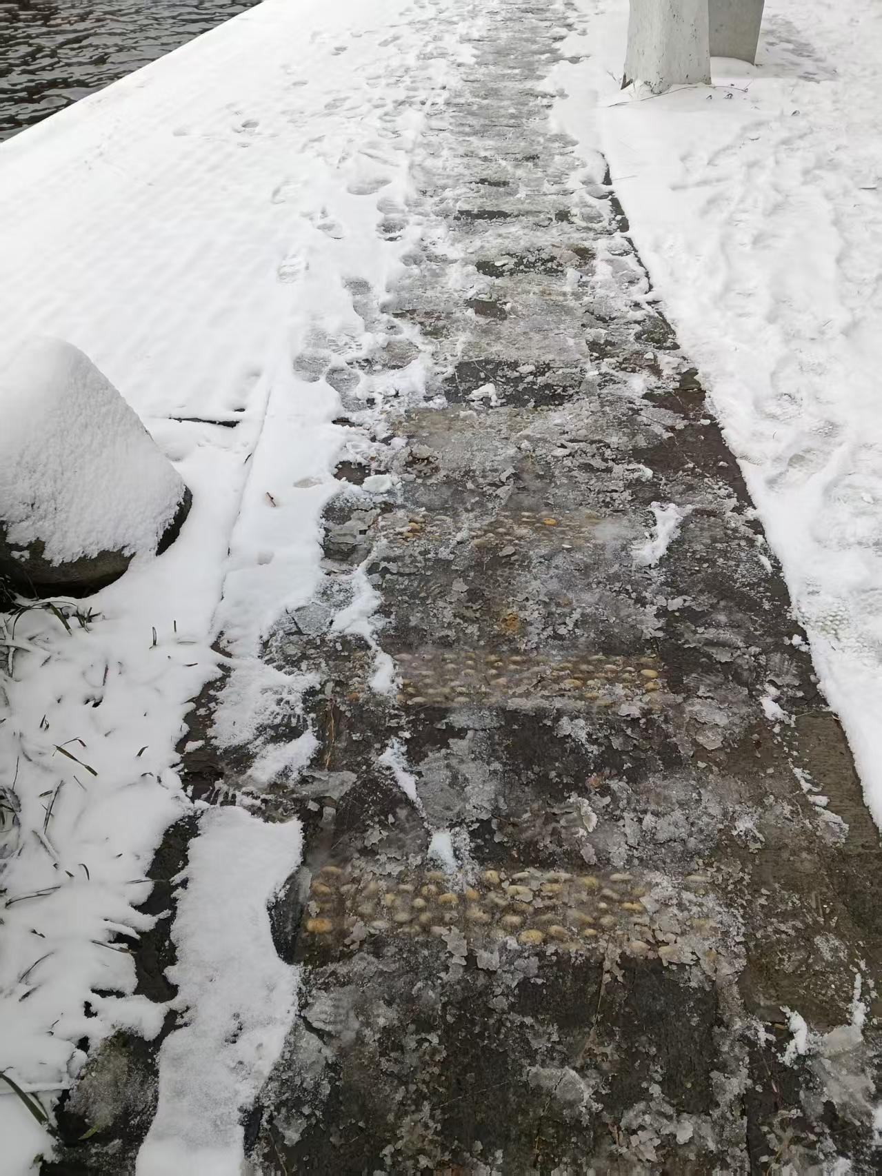 今天上午,在南京莫愁湖公园踏雪,才知道南京旅游景区公共设施,设计的是这样温馨,彰显着人性化。 南京莫愁湖公园湖边道路,设计的每隔约60公分铺一块条石,间隔铺上约20公分宽鹅卵石。有的道路中间铺的条石,两边铺色是30公分宽鹅卵石。 下雪天游客踩在鹅卵石上,很稳重防滑。鹅卵石的特殊作用起到了效果。 夏天,走在湖边道路,踩在鹅卵石上。原本以为是让游客踩踏,活络脚底经脉。 没想到下雪天,竟然还有这种特殊的效果。 这就是南京景区设施,一切注重于人性化设计。深受游客欢迎的人文之本。