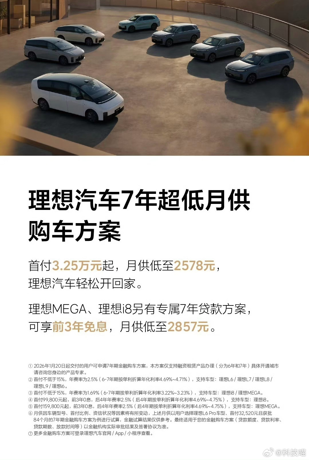 继特斯拉,小米YU7后,理想汽车发布限时7年超低月供购车方案。看了一下,适用于理想MEGA和理想i8,是买车前3年0利息,后4年年化费率2.50%