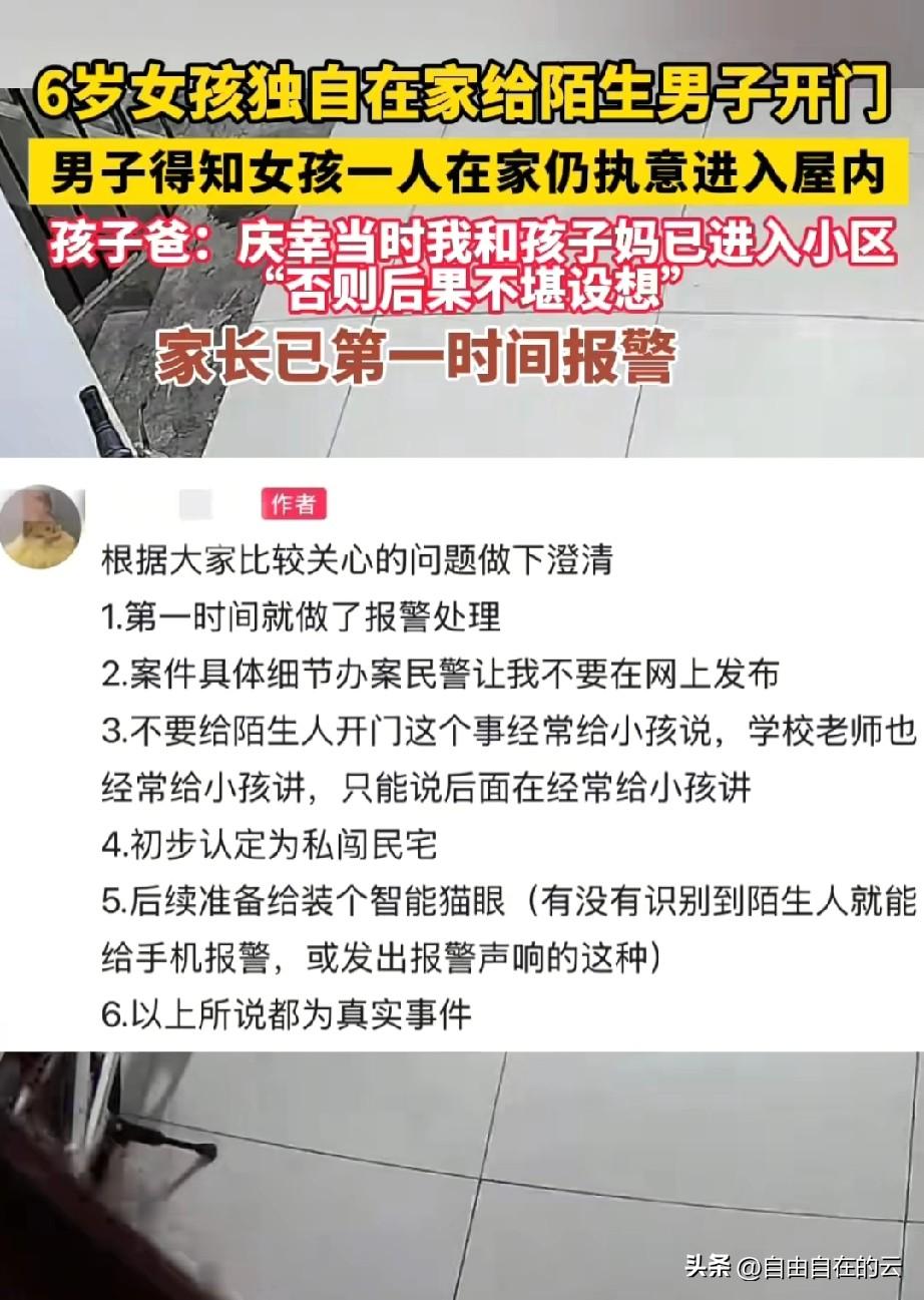 细极思恐。湖北武汉,有家长称他6岁的女儿独自在家时,有个中年男人过来敲门,孩子听