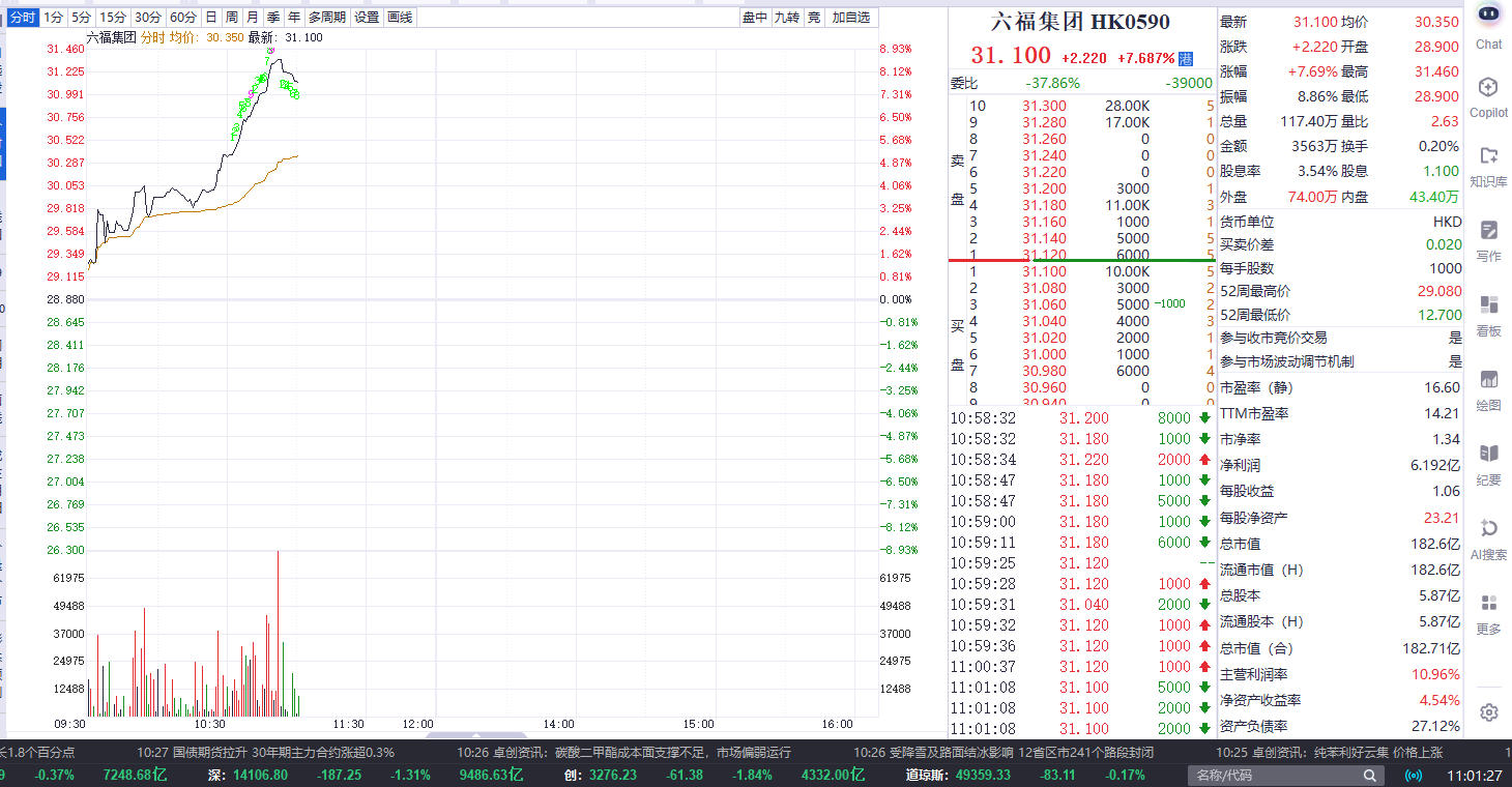 上证报中国证券网讯(李子健记者周亮)1月20日,六福集团股价高开高走。截至11时01分,六福集团股价为31.1港元/股,涨幅为7.69%。