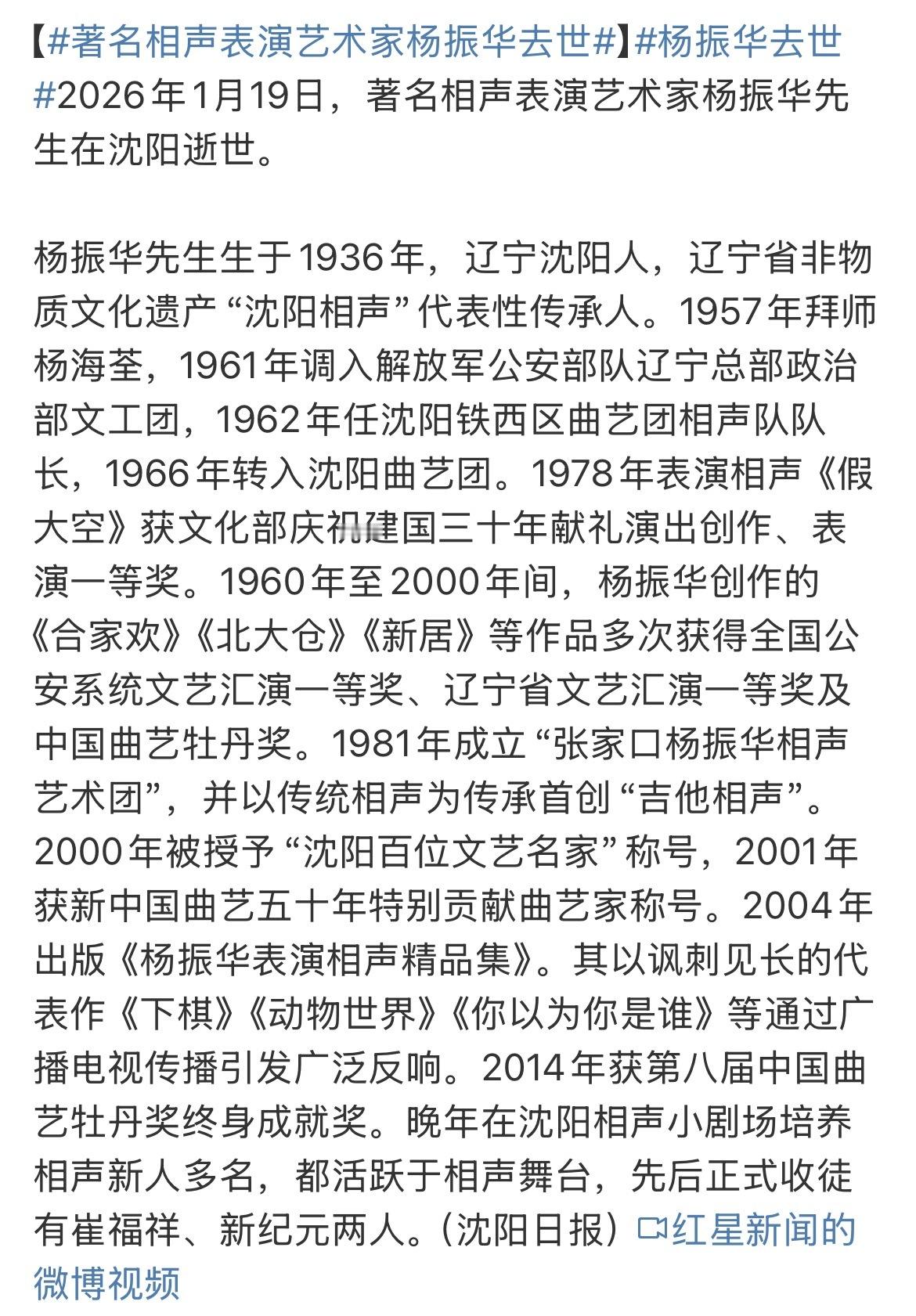 杨振华去世老先生九十岁离世,是喜丧死 亡 的终点是遗忘,但老先生的相声集会一直留存,这个世界上永远存在“杨振华”的声音