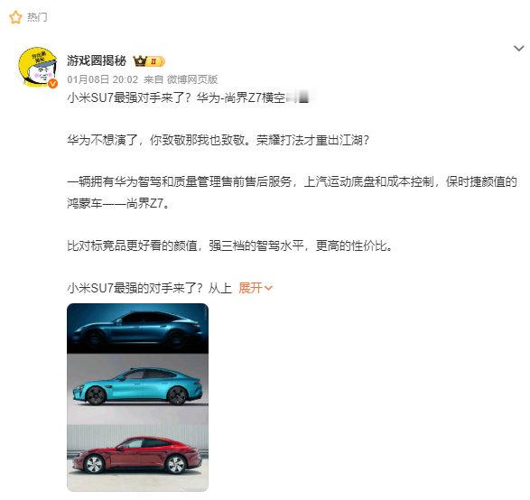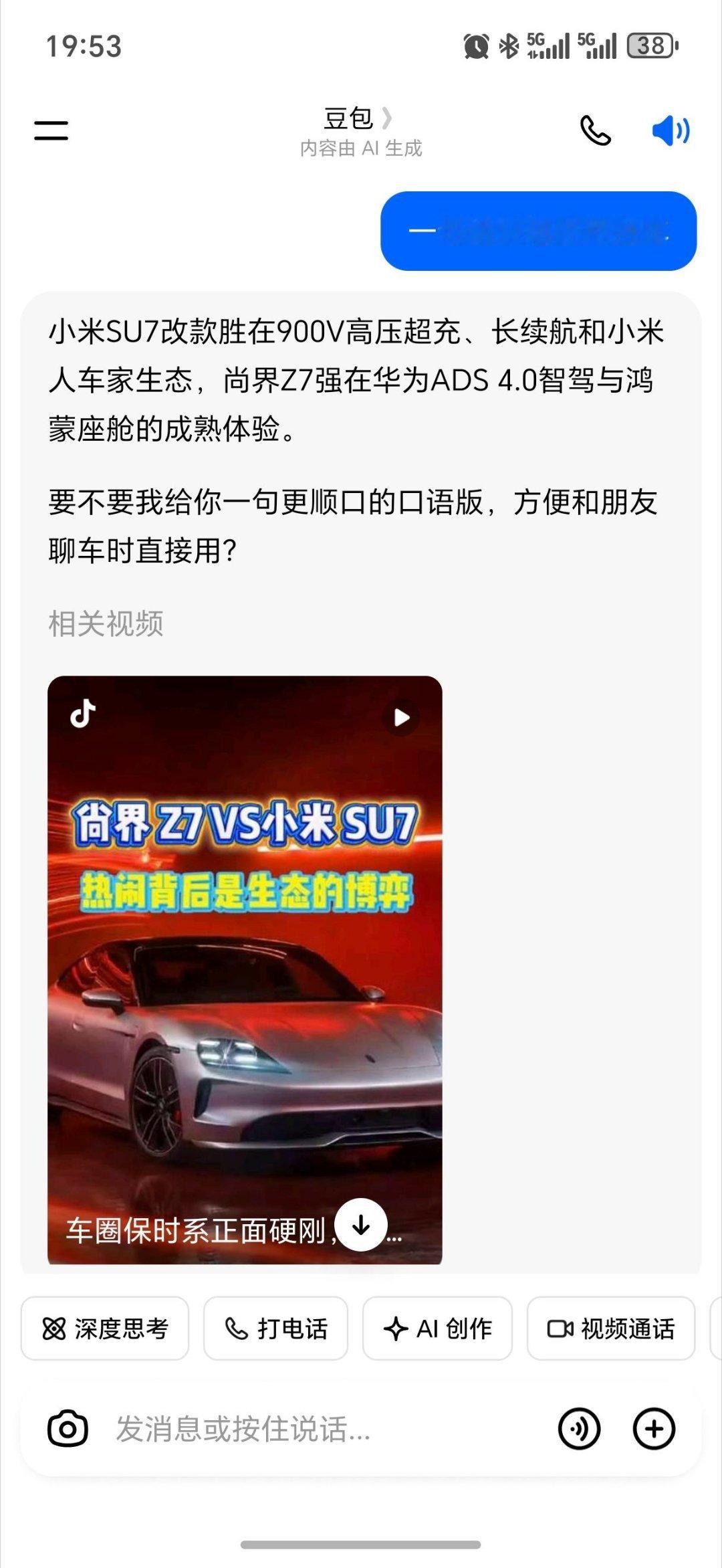 估计我以后要失业了,以后大家买车,也不用看我们测评了,问问豆包就够了。我试着问了一下,今年有哪些比较期待的豪华轿车,豆包第一个说的就是尚界Z7。但我觉得小米SU7改款也很不错,让豆包对比了一下。给的分析还挺到位,一句话总结就是。“小米SU7改款赢在900V超充、长续航和小米生态,尚界Z7胜在华为顶尖辅助驾驶和鸿蒙座舱的流畅互联~”和许多车圈人讨论的一样,看来尚界Z7还真将成小米SU7的最强对手了。这也符合预期,不过尚界Z7还没发布,电池和性能之类的信息太少,昨天的一波亮点前瞻预测倒是让大家对配置和设计细节一饱眼福。之前,尚界的概念图海报也直接喊话小米,比新一代更有期待感,看来今年轿跑市场真的要卷起来了!我觉得Z7确实可以期待一下,预计定价范围在25-35万,但我期待能比这个更便宜,坐等实车来~豆包预测尚界Z7或成SU7最强对手