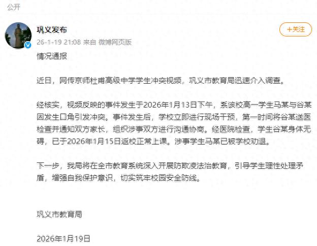 经核实,视频反映的事件发生于2026年1月13日下午,系该校高一学生马某与谷某因发生口角引发冲突。事件发生后,学校立即进行现场干预,第一时间将谷某送医检查并通知双方家长,组织涉事双方进行沟通协商。经医院检查,学生谷某身体无碍,已于2026年1月15日返校正常上课。涉事学生马某已被学校劝退。