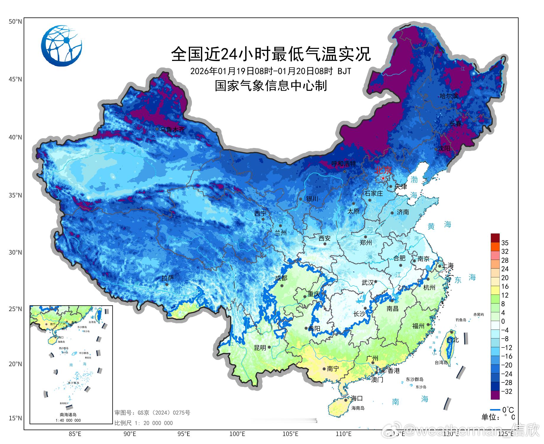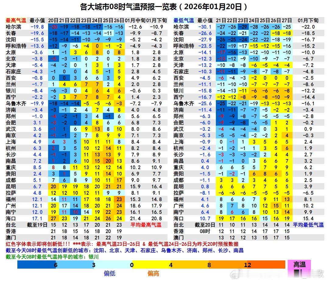 大寒 【气温创新低】今天进入大寒节气,恰逢有寒潮影响,天寒地冻。今晨截至8时,有9个省会首府直辖市气温创立冬后新低。石家庄和济南为今冬首次跌破零下10℃。具体为(℃):沈阳零下27.9、乌鲁木齐老国家站零下25.6、太原零下14.1、天津西青零下13.2、北京零下12.3、济南零下11.4、石家庄零下10.3、郑州零下6.3、长沙零下1.6、南昌0.4。预计明晨华北到江南部分城市气温可能还会创新低。南昌可能是今冬首次跌破0℃。
