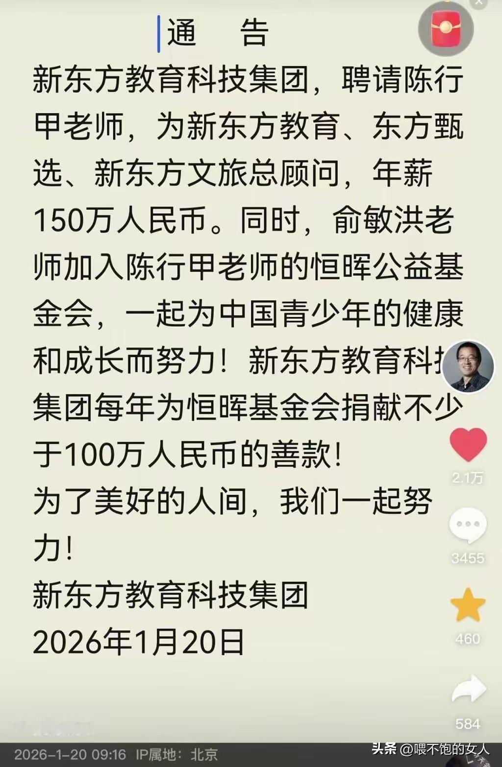 服不服?这回不嫌人家拿的多了吧。整整翻了一倍,真是天上掉大馅饼,这都是网友努力的结果。陈行甲得感谢网友啊!没有网友,俞敏洪会给你伸出援助之手吗?[捂脸][得意]估计是前两天俞敏洪看不下去了吧? 不过,人家老陈也确实有才,口才好的不得了,没办法,是金子在哪里总会发光,这么大年纪了,还遇到人生贵人,150万年薪怎么花啊?真羡慕。