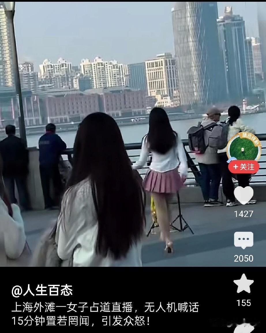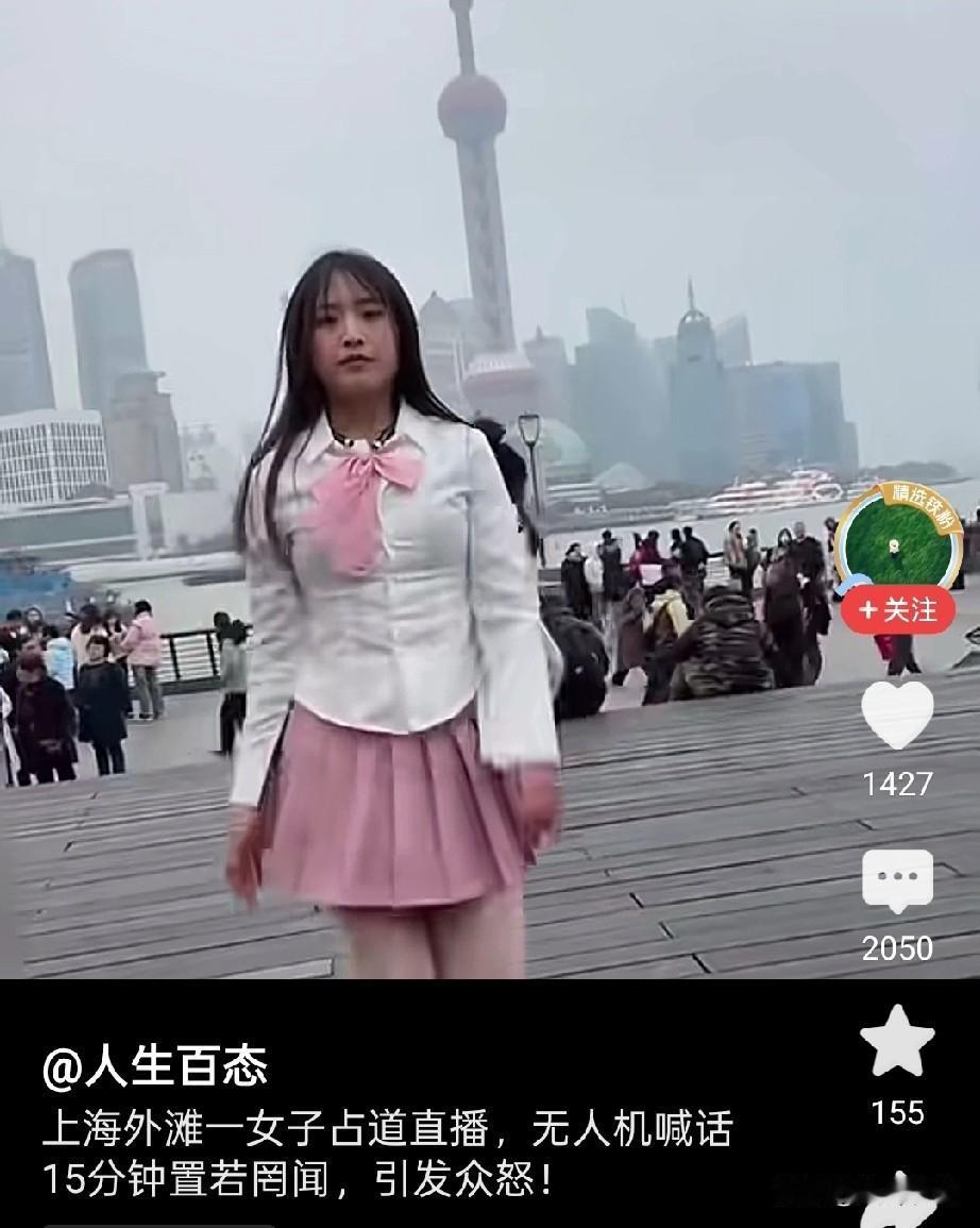 上海外滩一女子占道直播,无人机喊话15分钟,置若罔闻引众怒! 近日上海外滩惊现jk跳舞,一胖胖的女子,穿着粉色JK小短裙,在外滩跳起来舞蹈, 她以为自己是靓丽的风景线,实则就是一个小丑,周围的游客都在看她,旁边还有无人机向她喊话!已记录她的行为! 她装作没有听见,从容的还在跳舞,随着音乐响起,她不停的摇摆身体,舞蹈有些妖艳! 有两个女看到她都笑了,她看了对方一眼,眼里充满了不屑,依旧我行我素有人提醒她,还被她白眼斜视,做直播跳舞的人心理素质都这么高吗? 因此女生还上了新闻,媒体纷纷点名,抖音表示已提醒她整改多次,由于屡教不改,目前已经封禁了她的直播权限,网友纷纷谴责她不守规矩! 目前该女生粉丝狂掉,账号已经出了问题,没想到蹭个热点居然直接被流放!她为许多网红做出了不好的榜样! 网友表示应该对她进行拘留,罚款,还有网友表示直接封禁她的账号,让她长长记性!大家对于这事怎么看?不妨聊一聊! 上海 外滩唱歌直播 上海外滩唱播 外滩小姐 外滩直播乱象