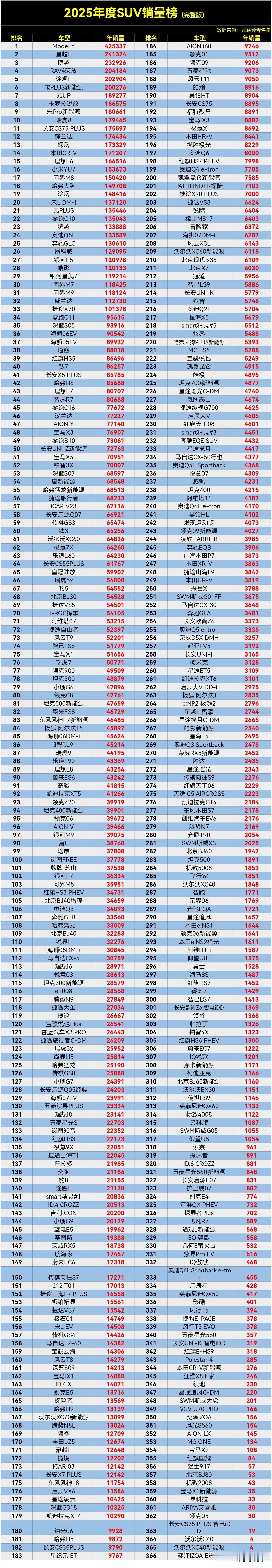 最近要买SUV的可以看看,2025年度SUV零售销量排行榜完整版公布了,数据显示,共有33款车型销量超10万辆大关,特斯拉ModelY依旧强势,以42.5万辆的成绩问鼎第一,吉利星越L和博越都入围前三,销量都在23万辆以上,RAV4荣放、途观L、宋PLUS新能源都20万辆出头,表现都十分亮眼,深受到消费者的青睐,快来看看你的车排第几名呢?