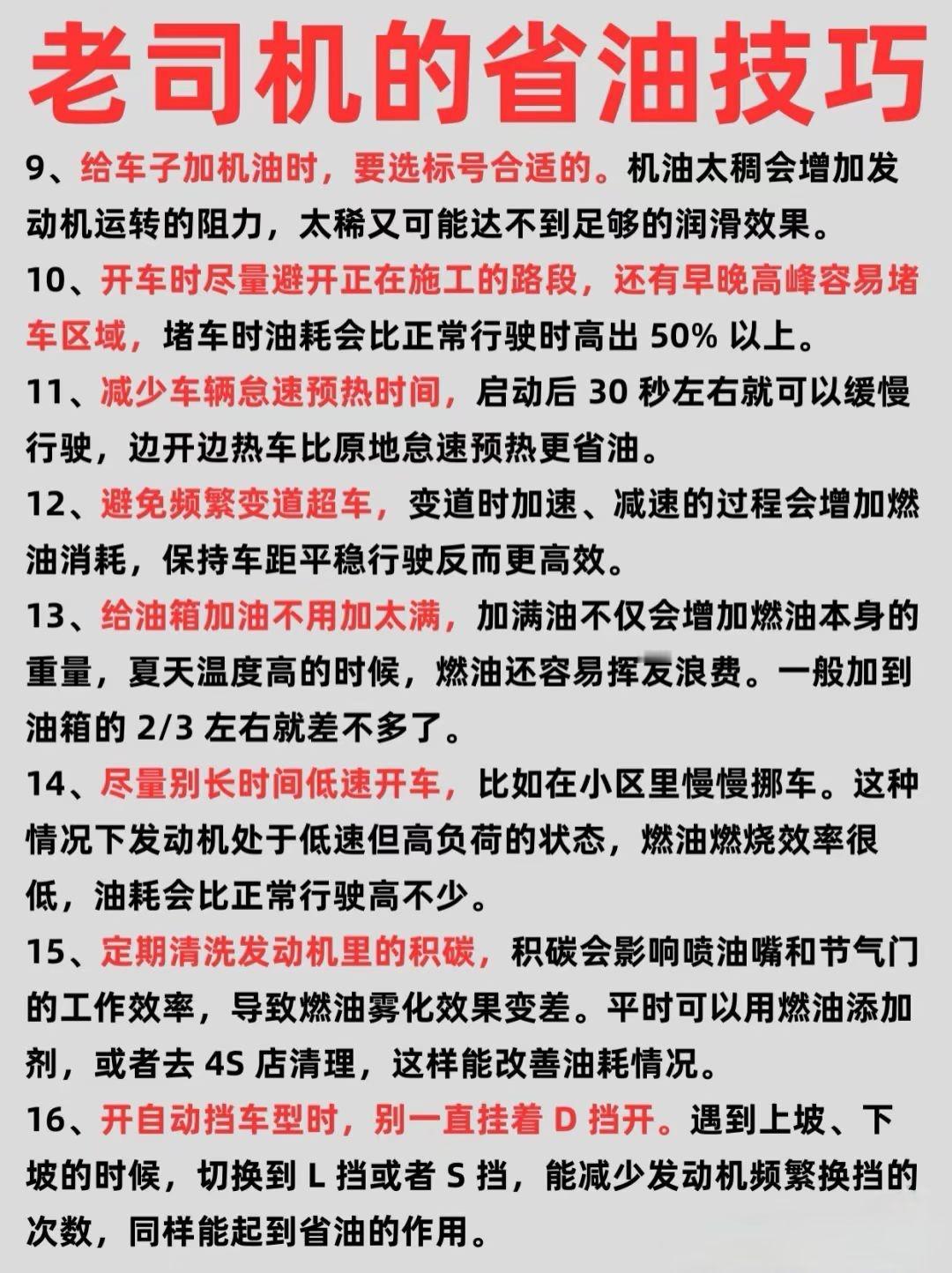 这样开车,更省油! 同一台车,不同的司机开,油耗相差会很大! 了解这些开车小窍门,让你的爱车越开越省油,越开越好开!建议转发收藏!