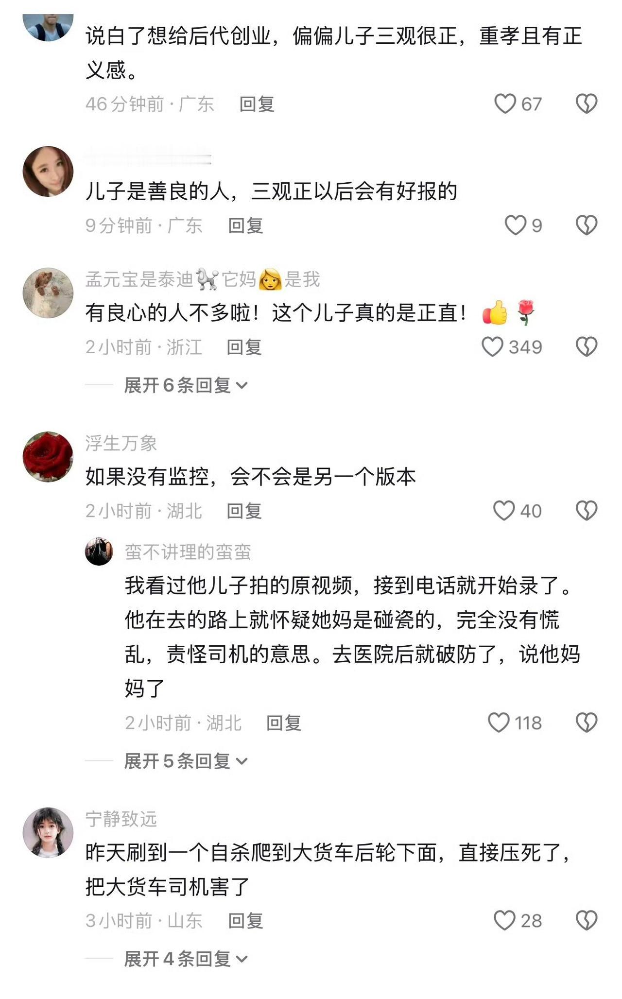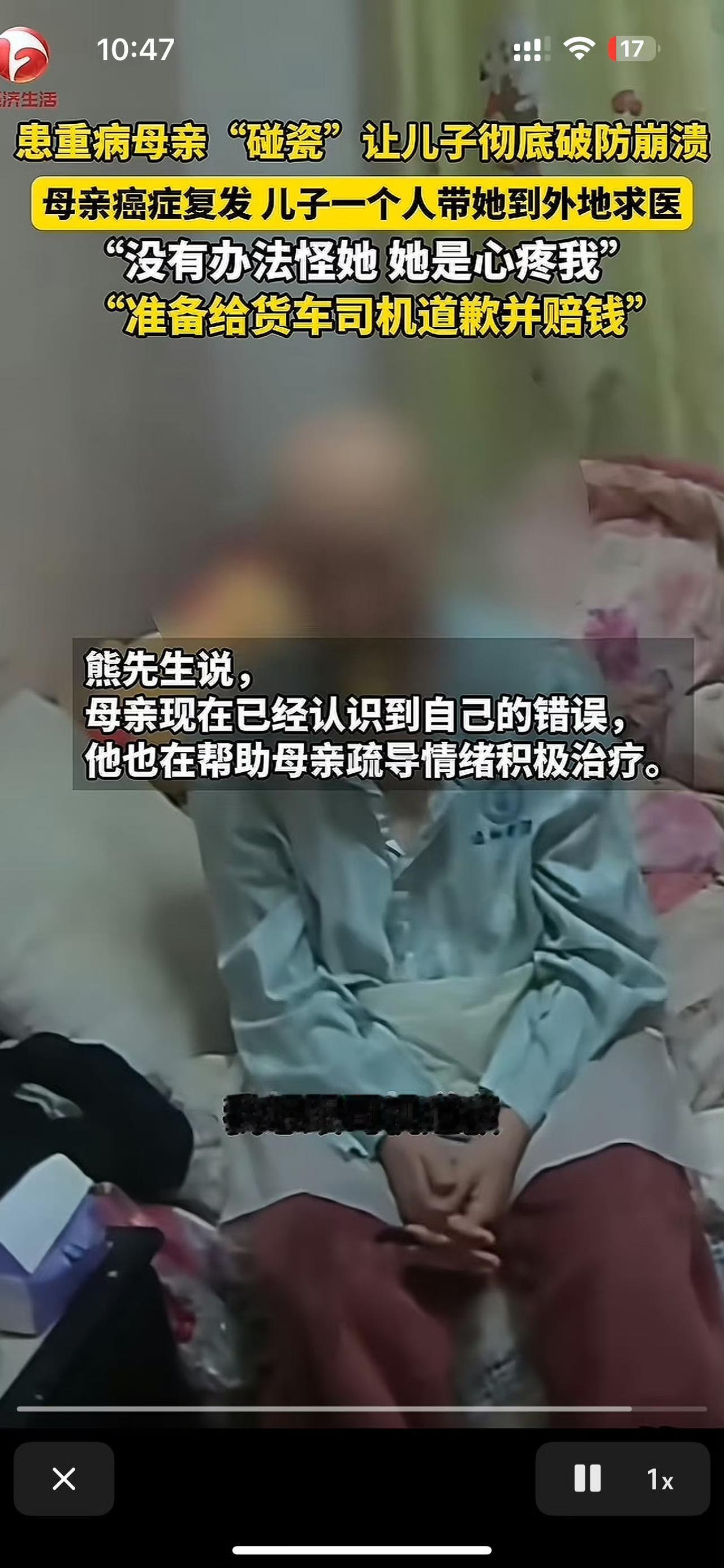 儿子怒吼癌症妈妈碰瓷是三观正, 但癌症妈妈的碰瓷是糊涂却也是无奈之举。 64岁口腔癌患者熊阿姨因多次治疗花费11万元,家庭经济压力巨大。1月17日,她趁儿子做饭时溜出出租屋,在距家一公里外的马路上故意靠近大货车佯装被撞,导致司机报警送医。 儿子熊先生赶到医院后,结合母亲此前流露的“碰瓷筹钱”念头及伤情,质问她“是不是想讹钱”。情绪激动下,他在病床前怒吼:“别人也有家庭要养,你为什么要祸害别人?”并强调“碰瓷违法,监控可证”。事后主动向司机道歉并承担救护车费用,同时将训斥视频公开。 看到这个事件的第一反应,是理解这妈妈的行为,得了口腔癌,治疗费用像座山,她退休工资有限,儿子单亲照顾,压力多大。绝望之下,她走了歪路,想靠碰瓷换钱。这不是她坏,是病和穷把人逼到角落,连基本的道德都顾不上了。普通人面对绝症,往往先被钱压垮,这现象不新鲜,但每次听都揪心。 儿子病床前的怒吼,字字戳心,句句在理——“别人也有家庭要养”,这是刻在骨子里的善良,是三观正到让人泪目的清醒。最难得的教养,是身处逆境却依然心存善意。真正的懂事,从来不是我弱我有理的索取,而是我虽不易,但绝不拖累他人的担当。 ​ 熊阿姨的糊涂,是穷途末路的慌不择路;儿子的正直,是淤泥里也不肯低头的坚守。这件事里没有坏人,只有被现实碾碎的普通人,在生活的夹缝里,拼尽全力地活着。