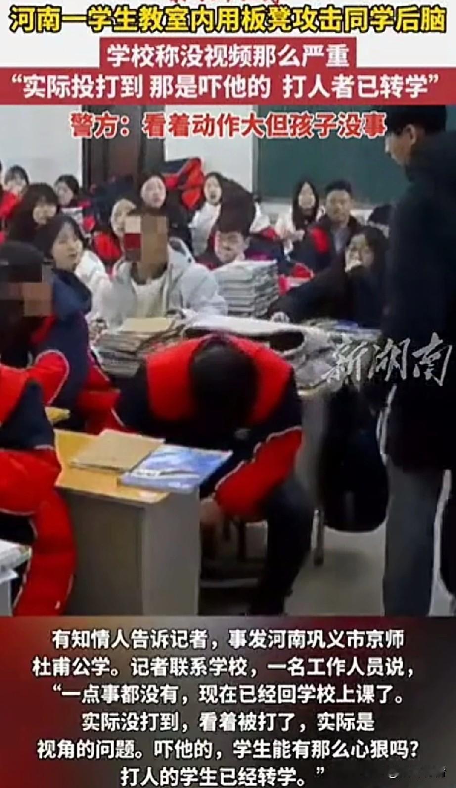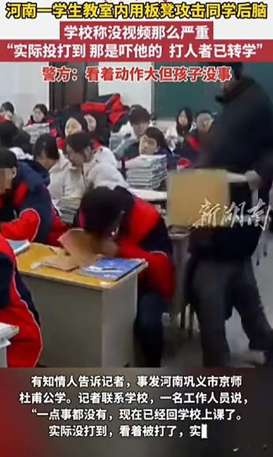 河南某学校的一段视频吓坏了网友,学生们都在教室里坐着,坐在前排的学生正在和同学开心聊天! 突然一名坐在最后面的学生抄起板凳就走了过来,没有丝毫打招呼,就在他的身后直接用板凳砸向了他的后脑勺! 周围的学生都被这一幕惊呆了,那名被砸的学生倒向了桌面,表情痛苦强撑着坐了起来! 那名砸人的学生拿起板凳又坐了回去,周围的同学赶紧上来查看被打同学的伤势, 教室的监控把男子打同学的视频完整拍了下来,这一幕又上传到了网络,瞬间在当地引起了轩然大波! 有记者前去采访,学校的工作人员表示根本就没有打到那个孩子,只是吓吓他而已,大家看到的只是角度问题,不过打人的学生已经转学了! 既然没有事儿,为什么孩子会转学? 另外两个人是不是有矛盾?难道平时老师没有注意到吗? 这动作万一 失误,可真的会出大事,同学之间竟然做出这么可怕的事情,真的让人很难想象! 大家对于学校发生这样的事儿怎么看? 河南 南阳学校事件 河南学生 学生遭板凳砸头