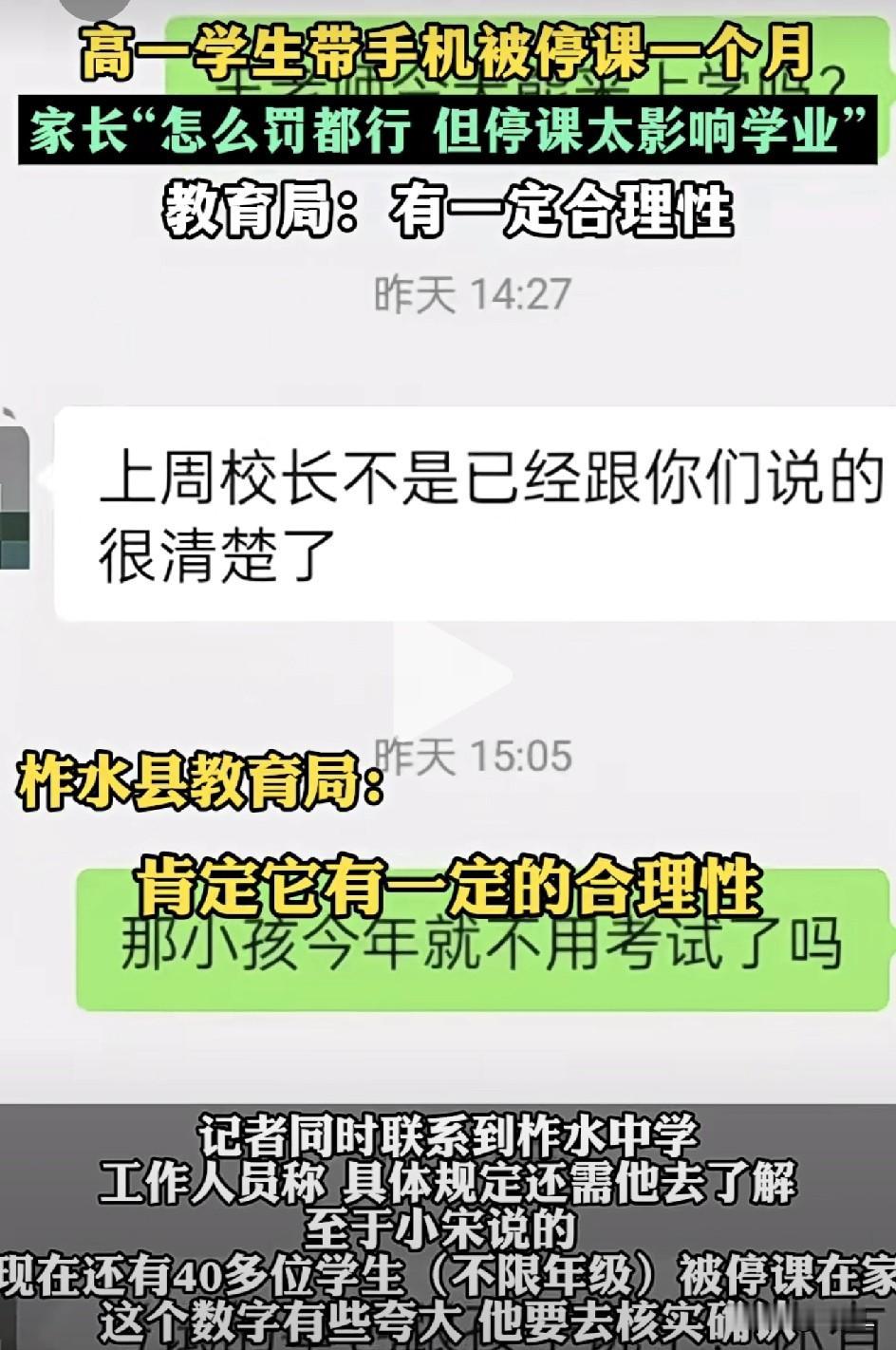 为了一部手机,高一女生被“封印”在家一个月!老爸求情:怎么罚都行,别耽误上课啊! 最近,陕西某高中一位宋老爸,可真是愁白了头。 他上高一的闺女,因为一部手机,被学校罚了“停课一个月”!现在孩子已经在家蹲了快俩星期,眼看着功课要跟不上了,爷俩是饭吃不下,觉睡不香。 小姑娘才15岁,爸妈离异,跟着在西安打工的老爸过。 至于为啥非要带手机?老爸也是无奈:孩子住校,周末得联系接送,平时还得用微信收生活费充饭卡,没个手机真不方便。 女孩也挺“努力”地想守规矩:一开始把手机放班主任那儿,放了五六回,老师嫌麻烦不收了;后来放校外小卖部,也不靠谱。出事儿那天,她本想找个别的老师临时保管,结果人家也没答应。 周日晚上,她只好硬着头皮把手机揣回了宿舍,结果周二就被宿管老师“人赃并获”——手机藏在笔记本里,还是被翻出来了。 学校的规定那是铁板一块:带手机进校园?停课一个月,没商量! 虽然去年12月就被查出来了,但等到班主任出差回来,处分才正式下来。今年1月7号,孩子被领回家,拿到一张假条,上面冷冰冰地写着返校日期:2月7号。算下来,整整一个月!比寒假都长。 “我当时就懵了!”宋老爸对着记者倒苦水,“孩子有错,我们认!你让她扫地、写检查、站墙角,怎么罚都行!但别不让她上课啊!这落下一个月的课,可怎么补?” 更让他心急的是,女儿刚进校时在1200人里排900名,最近一次考试好不容易爬到600名,正有起色呢。这一下子全耽误了。 为了让孩子早点回去上课,宋老爸算是把脸面全豁出去了。找班主任,班主任说“这是学校规定,找领导去”;托熟人找学校领导,领导反问:“你怎么知道她就犯这一次?”;找到县教育局,工作人员说:“学校有这规定,肯定有它的合理性嘛……” 这边家长急得冒火,那边孩子还透露了一个更惊人的消息:跟她同一批因为手机“落网”的同学有9个,而现在因此被停课在家的学生,可能多达四十多个,从高一到高三都有。 好家伙,这是捅了手机窝,还是学校在搞“集中整治”? 记者打电话到学校核实,有的老师直接挂电话,有的说“在上课”匆匆挂断,还有的说“40多人这个数字可能夸张了”,但之后再打电话,就没人接了。 这事儿闹的,让人不由得想说道几句。 学校禁止手机,初衷肯定是好的,怕孩子沉迷,影响学习。这个大伙儿都理解。但管理手段是不是只有“停课”这一招“王炸”?有没有更讲方法、更有人情味的办法? 你看,有的学校就规定:特殊情况非要带手机?可以!家长申请,交给班主任统一保管,需要用的时候再去领,用完了马上交回去。这样既解决了孩子的实际困难,又管住了手机。 教育专家也说,学校有权管,但要注意方式。不能简单用“长期停课”来剥夺。批评教育、引导认识错误,让孩子心服口服,才是真正的教育。 现在,宋老爸和几位同样遭遇的家长,还在四处奔波。孩子天天在家,对着课本干瞪眼。学校用最严厉的处罚,划清了管理的底线,但似乎也切断了一些沟通和理解的桥梁。 这“停课一个月”的重罚,是树立了威严,还是制造了对立?是让孩子怕了,还是让孩子和家长都寒了心? 手机该怎么管,确实是个难题。但有一点是肯定的:教育,除了冰冷的规矩,还需要温度和方法。 一禁了之、一罚了之,或许最省事,但未必最有效,也未必最负责任。 各位朋友,你们觉得呢?学校这“一个月”的罚单,开得合适吗?如果你是家长,你会怎么办? 素材来源:大风新闻,侵联删! 带定位晒今日生活 我的今日状态:💰期待暴富 我这里的天气:🌤️多云