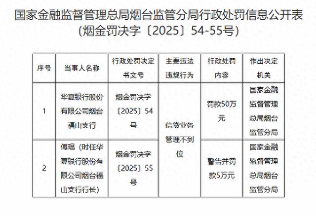 处罚信息显示,华夏银行股份有限公司烟台福山支行因信贷业务管理不到位被国家金融监督管理总局烟台监管分局罚款50万元;时任华夏银行股份有限公司烟台福山支行行长傅琨被处以警告并罚款5万元。