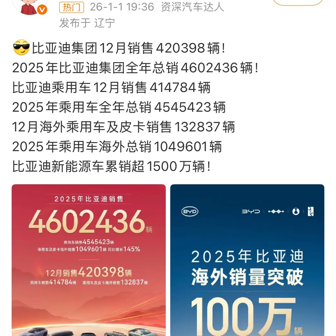 比亚迪全球四连冠,应该早就没悬念了,只不过2025年全年销量,值得细品。首先,高端化布局上,方程豹、腾势以及仰望三大高端品牌,占比亚迪集团整体销量的比例,从2024年的4.5%,增长到去年的8.7%,产品结构进一步向上延展。其次,海外市场也在猛猛发力,2025年一整年,比亚迪乘用车及皮卡海外累计销售104.96万辆,同比增长145%。这是最关键的!如果说高端品牌的成功,能提高企业利润,那在海外市场撕开一个口子,就意味着连续四年斩获全球新能源汽车市场冠军可能只是一个新的起点。2025年比亚迪累计销量达460.24万辆,大家可以预测一下,2026年这一数据能增长到多少?