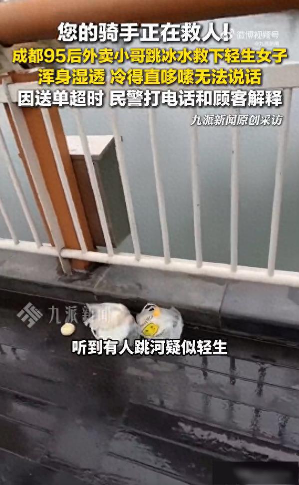 1月19日,四川成都。95后外卖小哥进入冰水救下跳河女子,事后默默离去。19日,当事小哥唐琪告诉九派新闻,听到有人跳河后便立刻停车下水去救人,还好水流不急,自己先后拉她两次,最终被消防救上岸。其称救起人后自己浑身湿透,冷得哆嗦,没法说话。