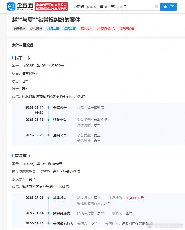 赵丽颖黑粉被列为失信被执行人赵丽颖黑粉被判赔8万元并道歉据企查查APP信息,近日,赵丽颖起诉夏某某名誉权纠纷一案更新,夏某某因违反财产报告制度被列为失信被执行人。据悉,法院判处夏某某赔偿赵丽颖精神损害抚慰金50000元、律师费30000元,并在涉案账号以及人民法院报上公开道歉。此前,夏某某已被限制高消费。