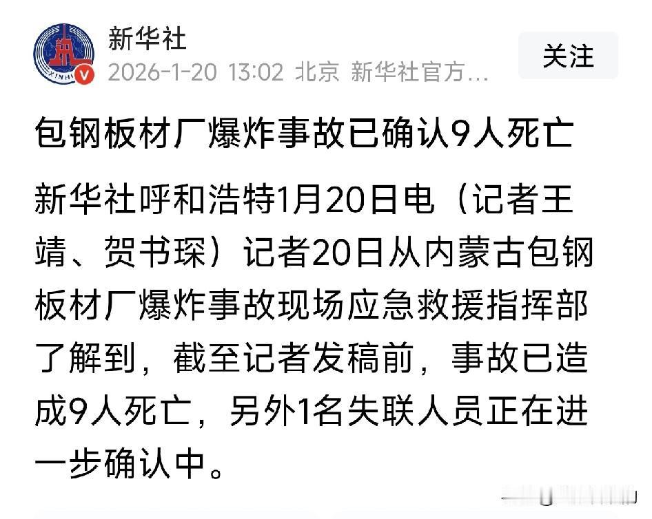 揪心!包钢爆炸已致9人遇难,1人仍失联,安全生产警钟再敲响! 1月18号下午3点多,内蒙古包头包钢板材厂的一声巨响,打破了周边的平静。 这是一起650立方米饱和水、蒸汽球罐发生的爆炸,事故的惨烈程度远超想象。截至今天的最新通报,已确认9人遇难,还有1名失联人员仍在全力搜救中,另外84名伤员正在接受治疗,其中5人重症。 事故发生的时候,当地气温已经跌到零下三十多度,天寒地冻的天气里,救援人员一刻都不敢耽搁,争分夺秒在现场开展搜救。冰冷的寒风刮在脸上生疼,但没人退缩,大家心里都盼着能有奇迹发生。 安全生产这四个字,说起来简单,落实起来真的半点不能含糊。每一次疏忽大意,都可能酿成无法挽回的悲剧。 希望失联的人能被尽快找到,也希望受伤的工友们能早日康复。生命经不起“如果”,安全容不下“马虎”,希望这样的悲剧不再发生。愿逝者安息,生者警醒!(图片来源于网络,侵删)