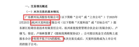 如果把时间线再往前拉,天宽科技的资本故事其实并不陌生。2025年2月,群兴玩具(002575.SZ)曾公告拟以现金方式收购天宽科技不低于51%股权,彼时给出的整体估值上限为8亿元。但这场交易在当年10月宣告终止,原因是双方未能在交易价格和方案等核心条款上达成一致。