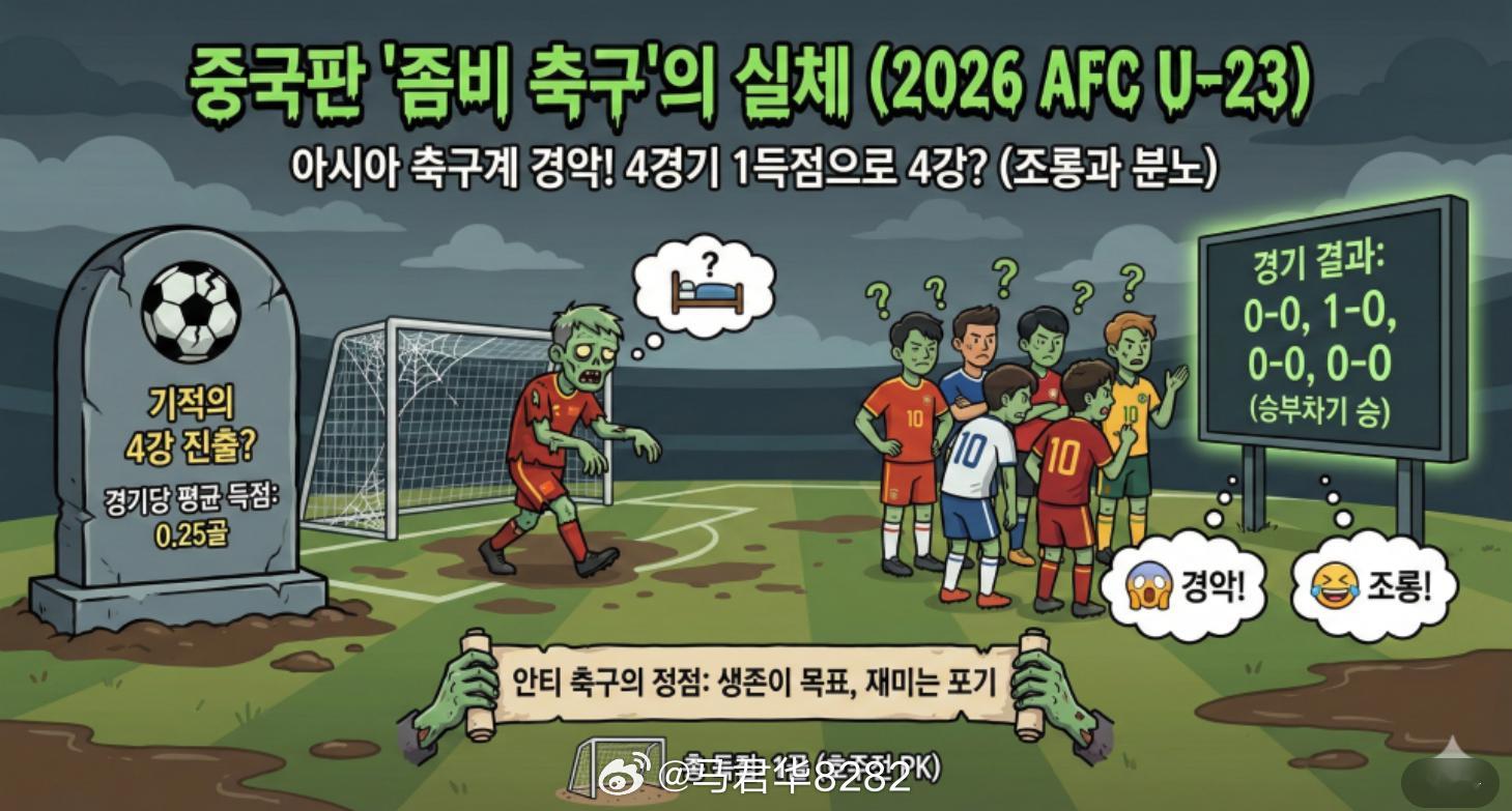 韩国某自媒体用AI做的图。图1说咱们做好了摆大巴的准备,右边是韩国籍主帅金相植。图2说咱们只进1球打入四强,踢的是僵尸足球。不过,韩国人时不时也会形容自己的球队踢僵尸足球,有时候是褒义(打不死,有韧劲),有时候是贬义。我只想说,防守足球也有防守足球的魅力,阵型的保持、距离的保持、互相协防补位,踢好了就是艺术。U23亚洲杯国足u23u23国足vs越南u23