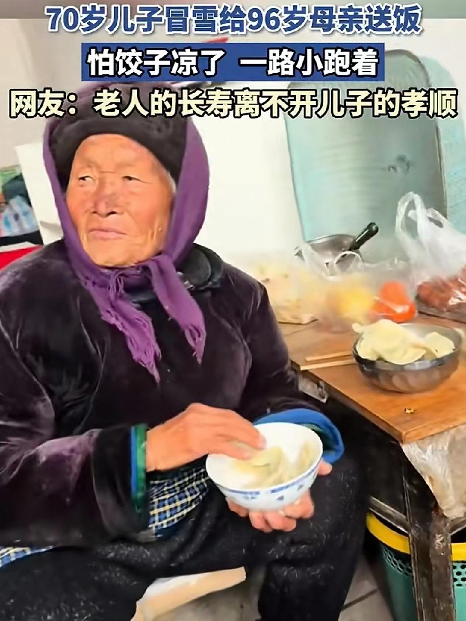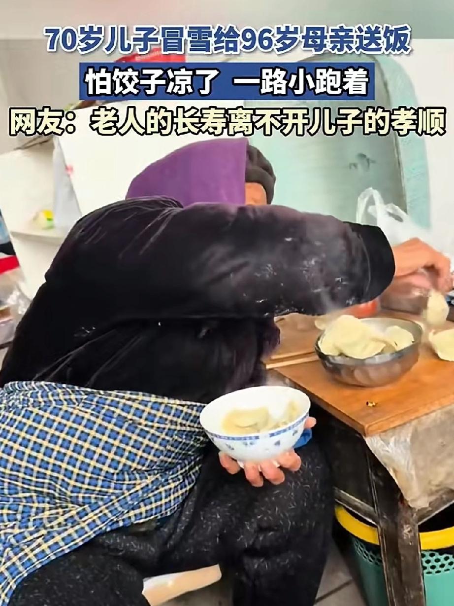 雪天中一位70岁的老人手里拎着一碗被裹的严严实实的饺子,一路小跑直奔母亲而去。 虽是数九寒天,高龄母亲依然能吃到热气腾腾的饺子,这碗饺子不仅暖热了老母亲的心,同时也感动了无数网友的心!老人的长寿离不开孝顺的儿子! 是啊!这一幕怎不令人感动!趁着父母健在,当儿女的拿出真心来好好孝敬吧!假如哪天不在了,再也没机会尽孝了!