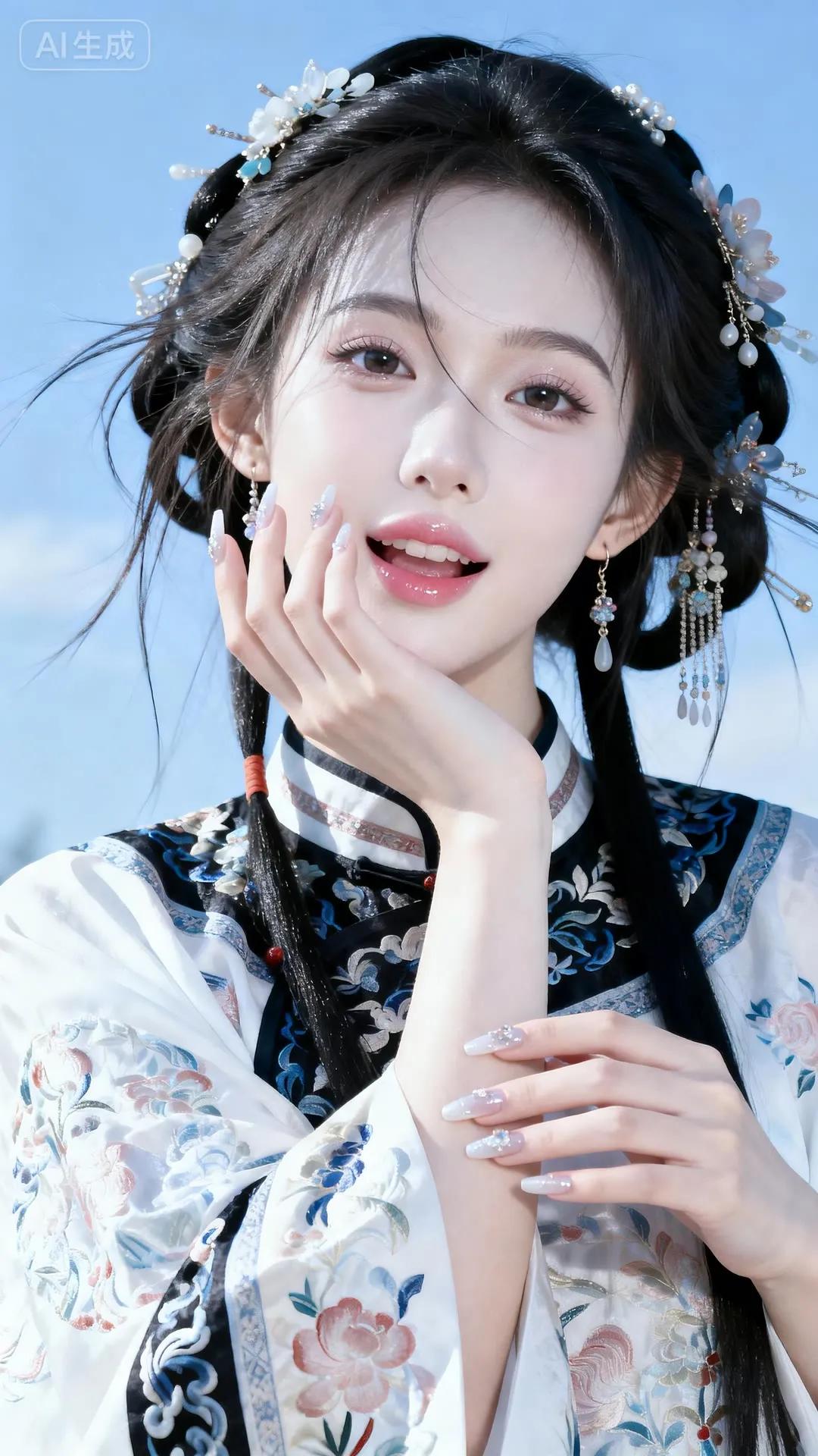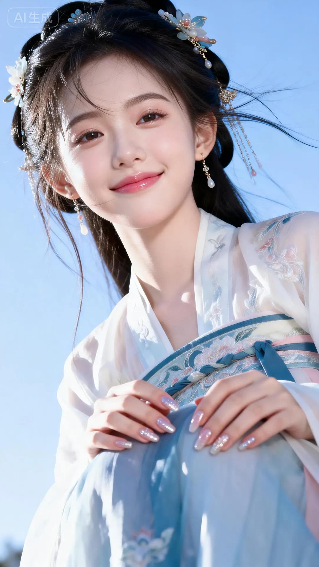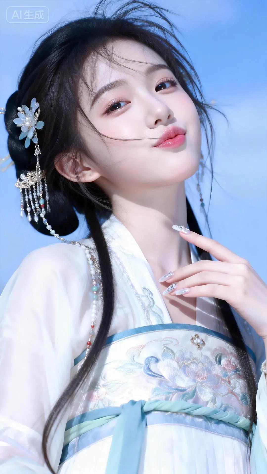 温柔古风少女,蓝白相间华服,发间花饰点缀,宛如仙子降临。