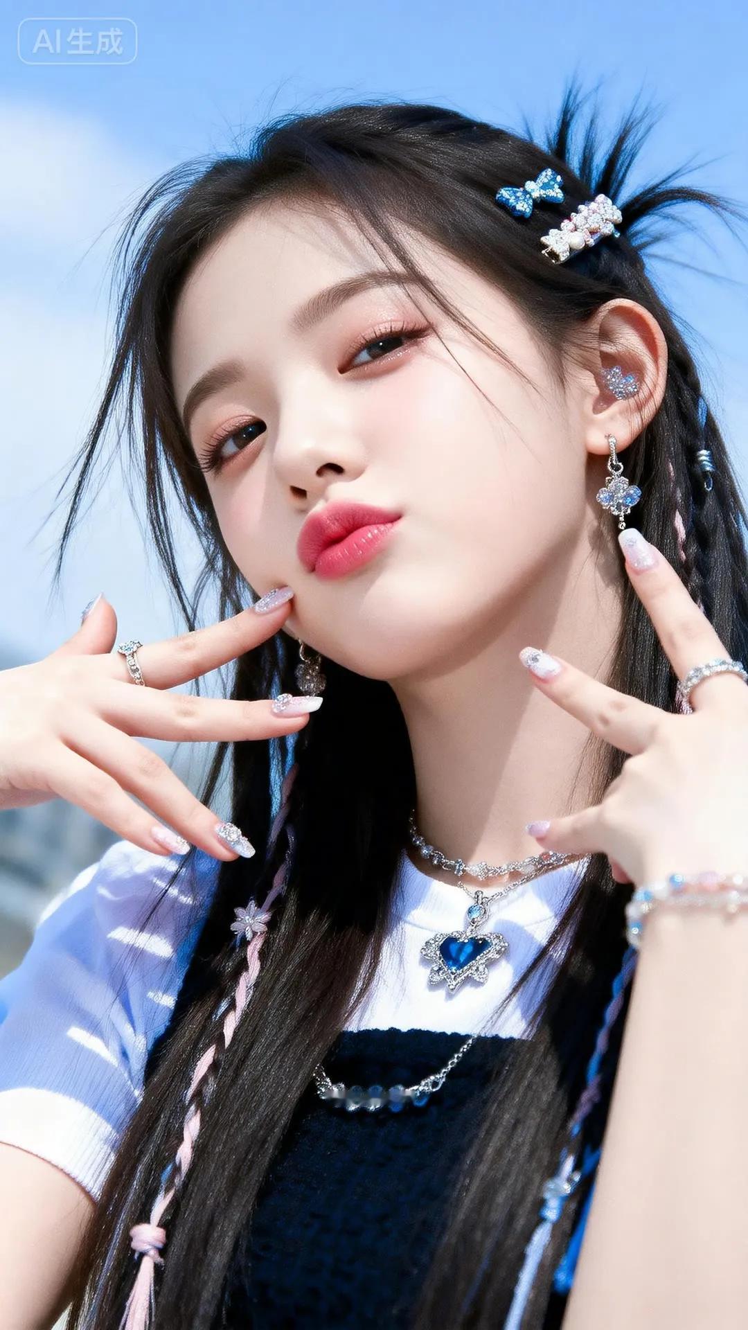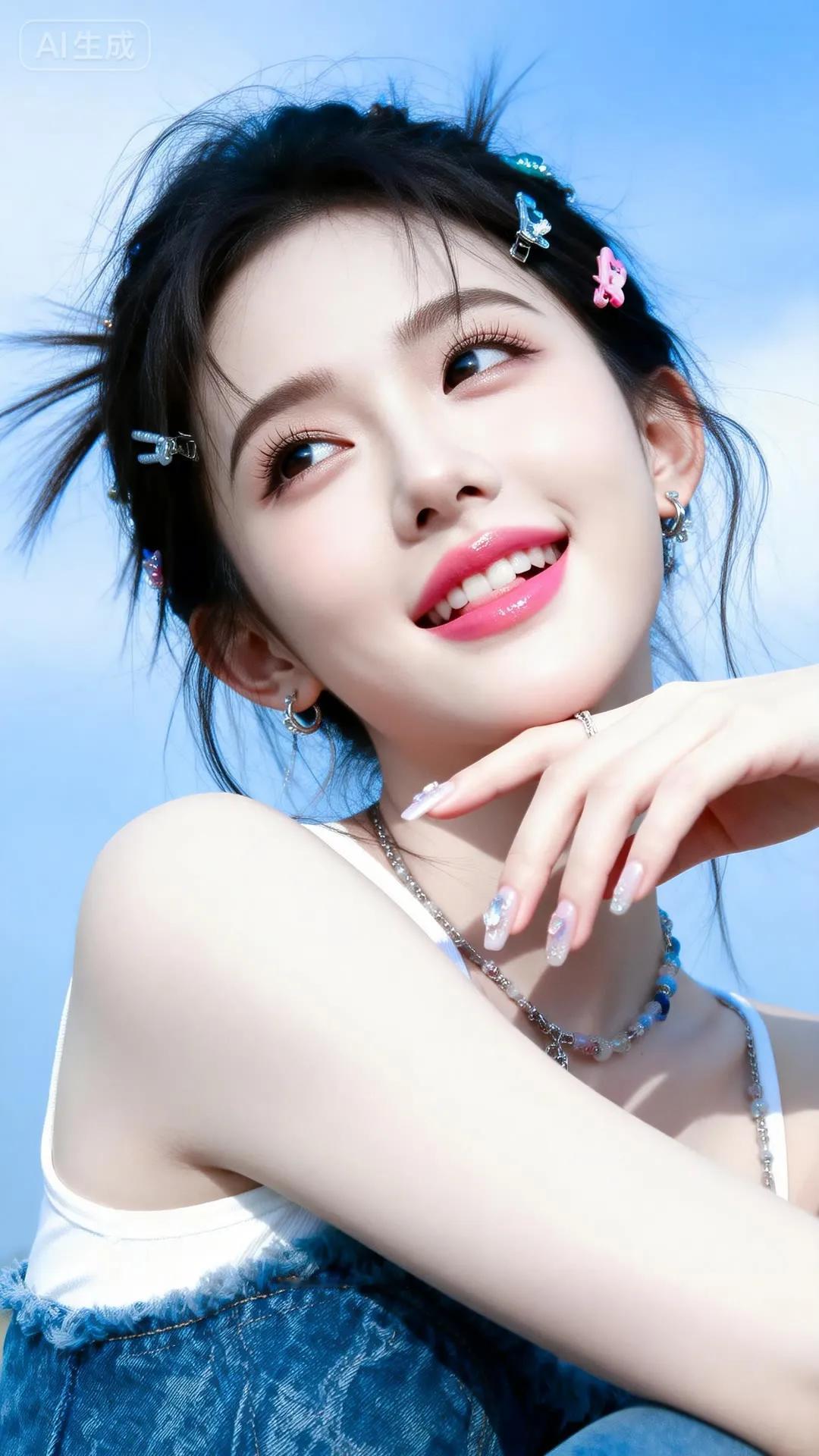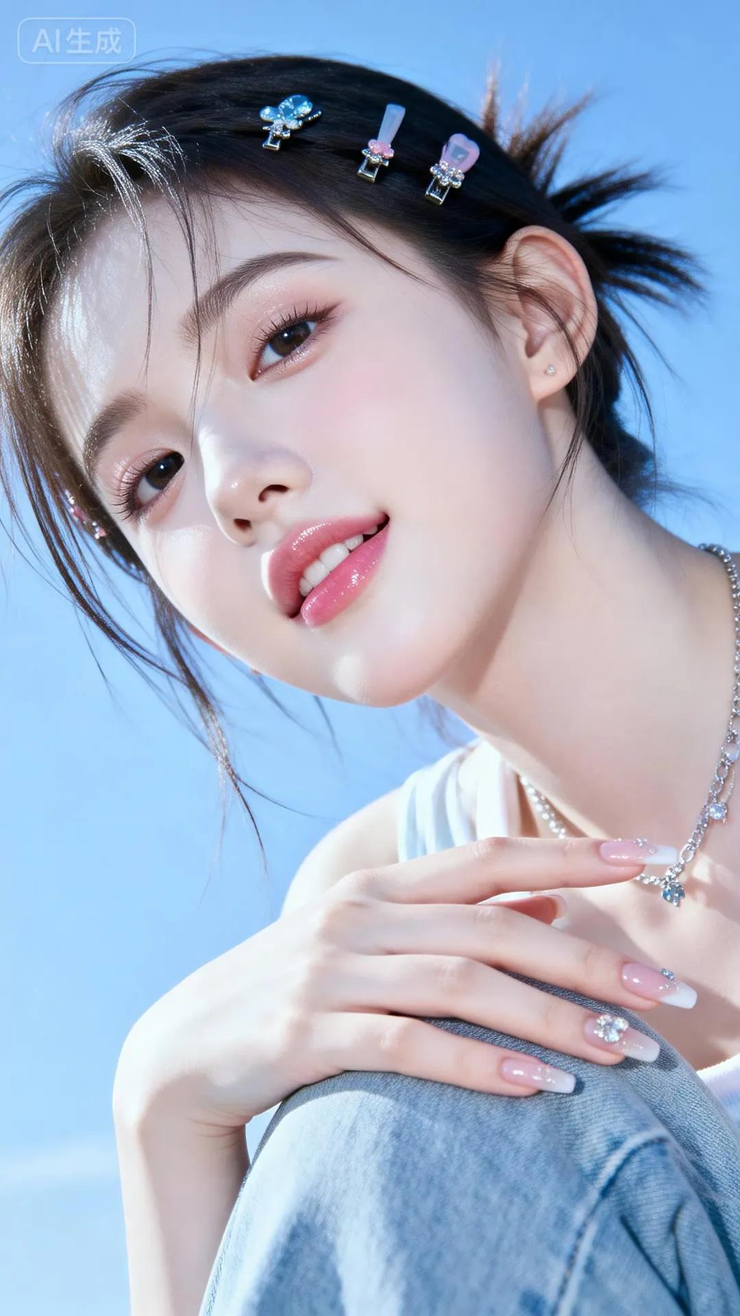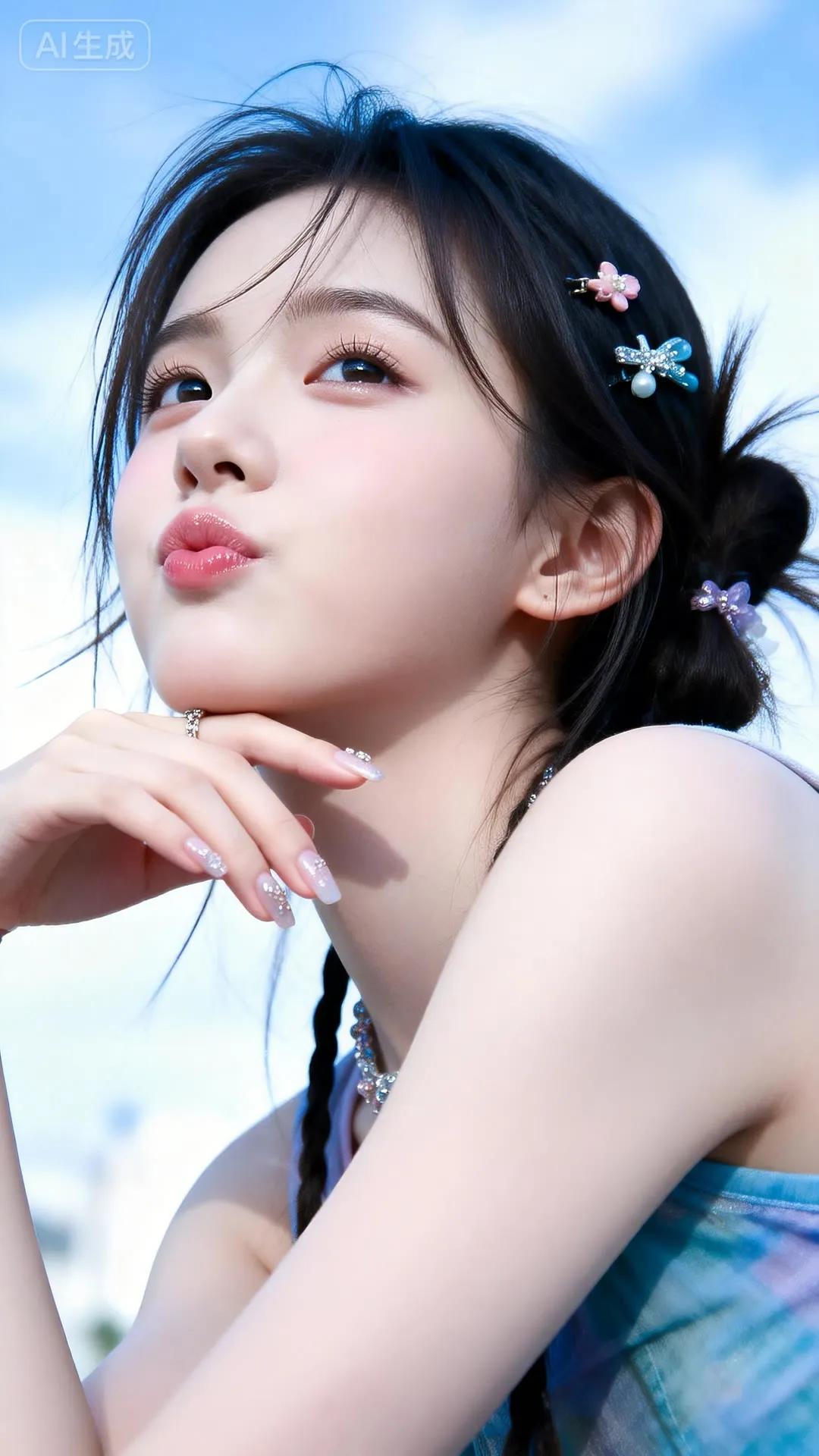 温柔古风少女,蓝白相间华服,发间花饰点缀,宛如仙子降临。