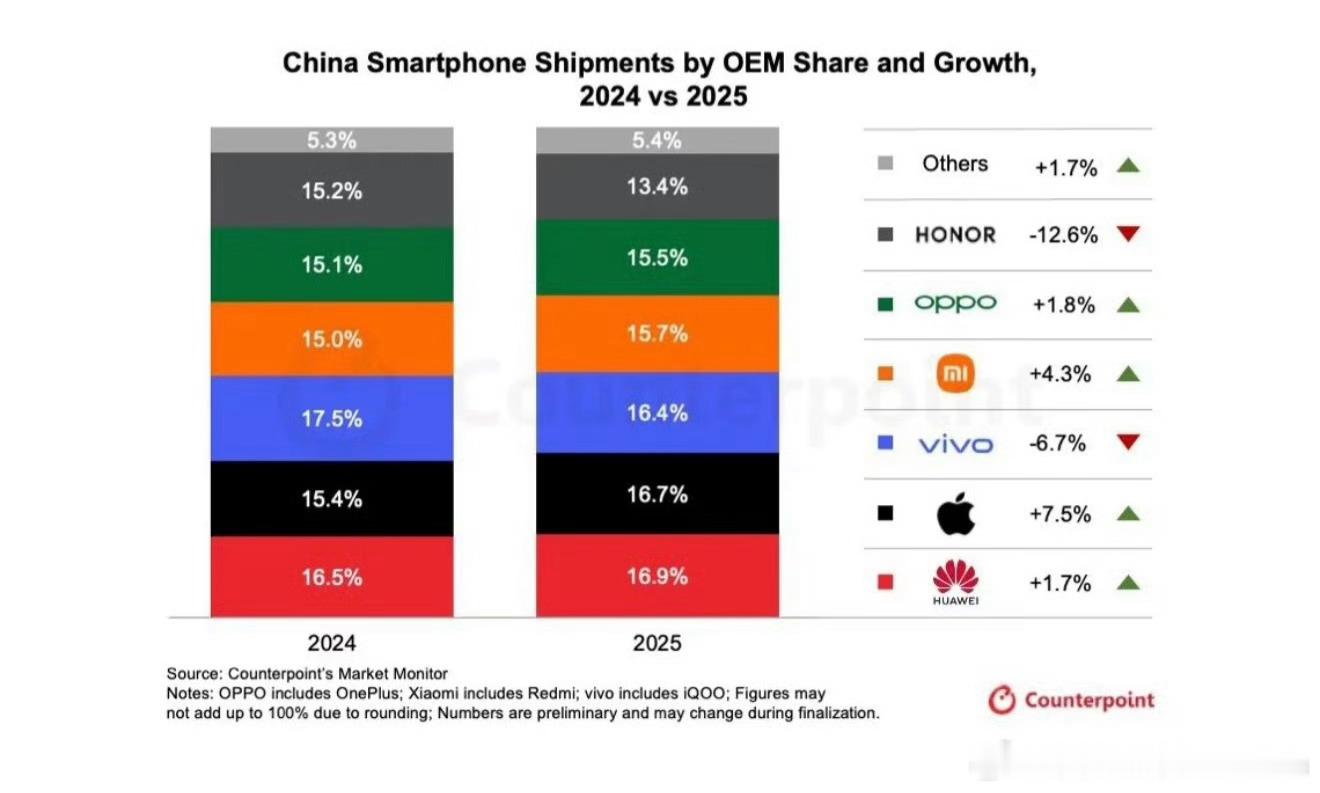 野榜?华为第一?苹果第二?Counterpoint,算权威吗华为2025年中国智