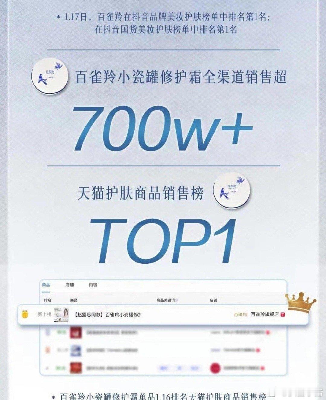 赵露思百雀羚代言官宣战报官宣三日全渠道总销售 4800w➕!抖美妆护肤榜 TOP1!