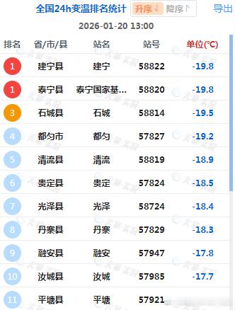 【剧烈降温】因为寒潮影响,今天13时对比昨天13时,福建、江西、贵州部分站点降温接近20℃。比如福建建宁降19.8℃、泰宁降19.8℃、江西石城降19.5℃、贵州都匀降19.2℃。昨天下午14时,建宁26.5℃,今天下午建宁的气温不会有太大起色,对比14时的降温,应该会超20℃。