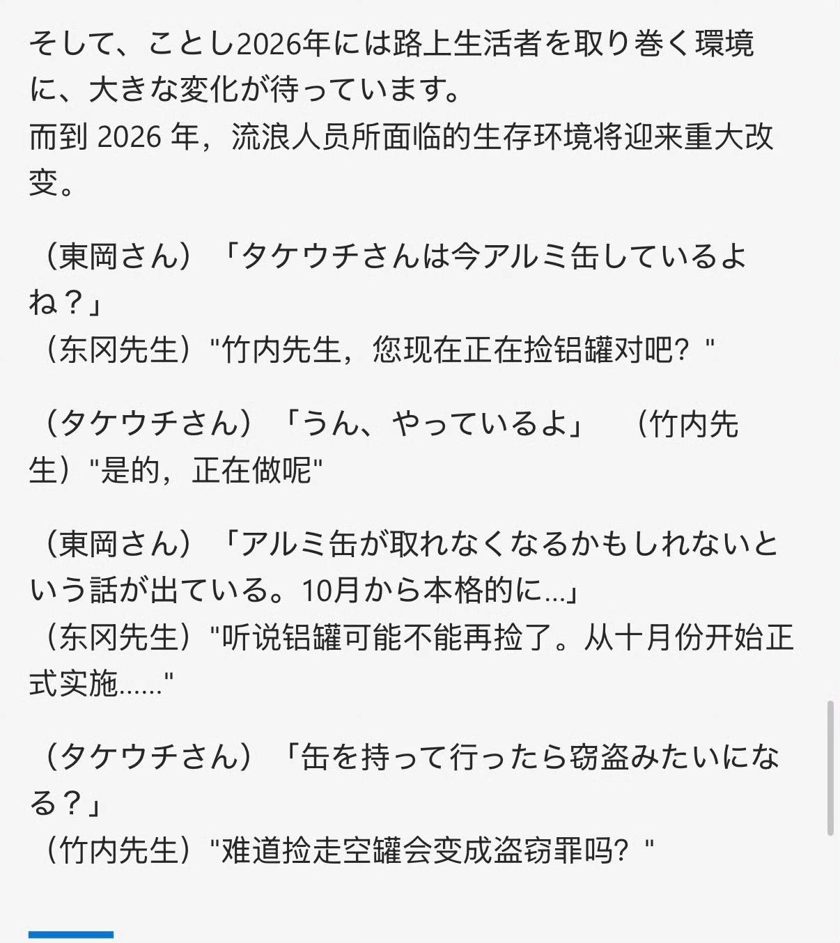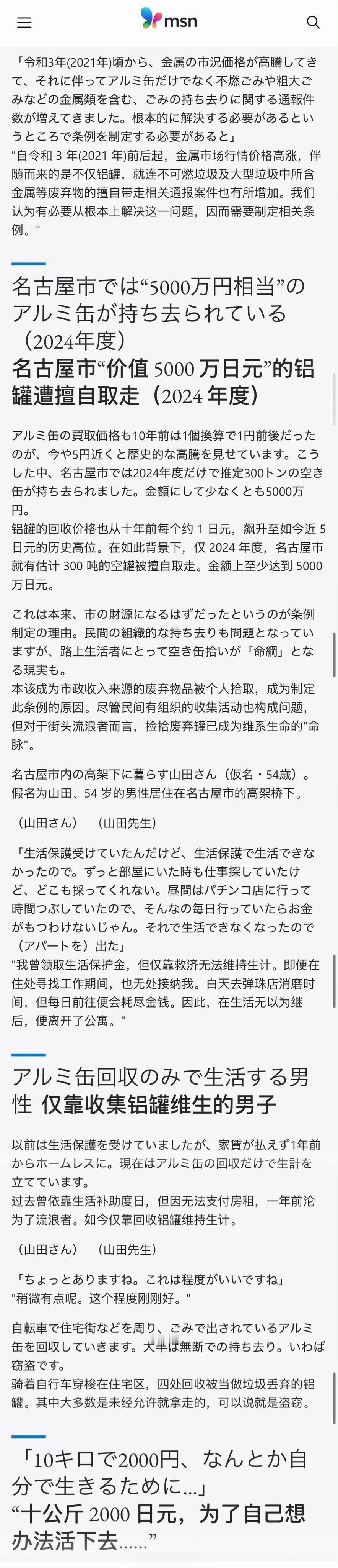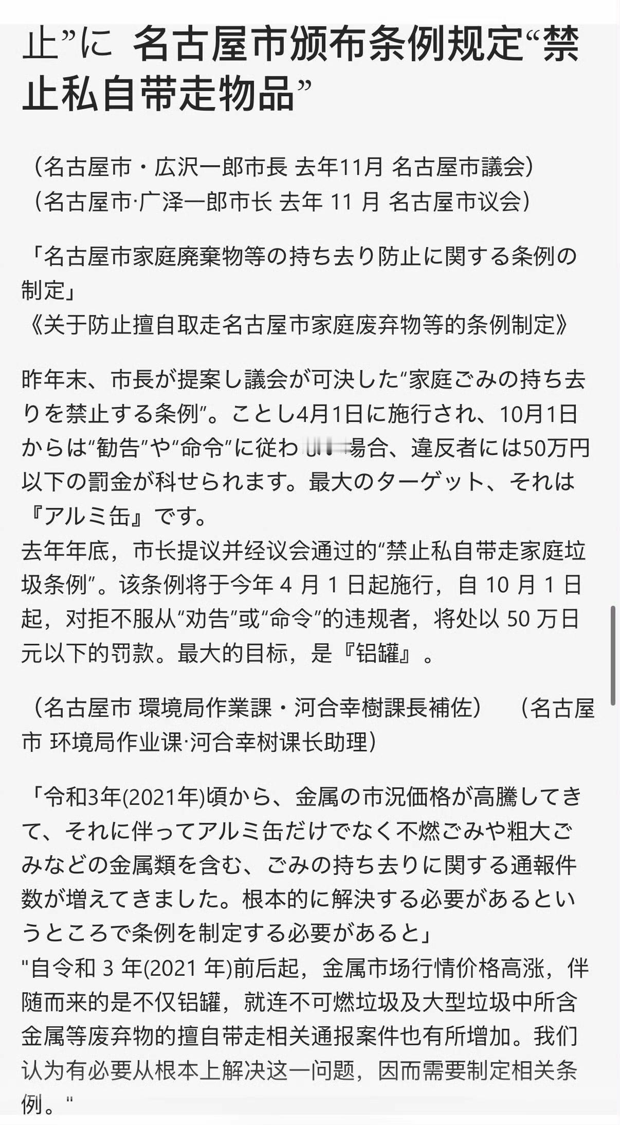 我以为日本为了渡过难关,只是回收和稀土相关的废品,比如汽车,比如手机,结果让我傻掉。日本出台了一项法令,从今年四月起,名古屋市将禁止“捡垃圾”,违者将处以 50 万日元以下的罚款。给出的理由是:这些生活垃圾(尤其是易拉罐)是名古屋市政府的收入。如果仅仅出台这个政策社会没什么反应也好,但实际情况是很多低收入人群反对,因为很多低收入人群是靠着回收废品在补贴家用。没想到呀,完全没想到呀。