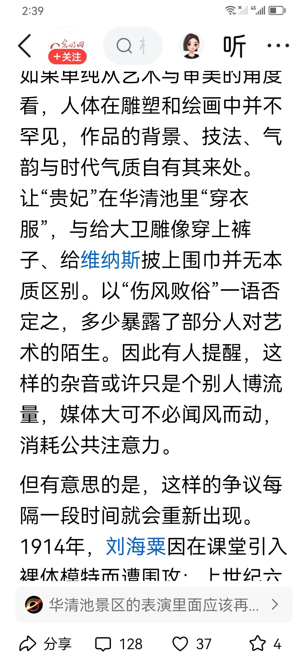 光明日报马青发文:主张贵妃出浴雕刻继续在华清池景点供游客参观,欣赏,破艺术禁個。 他说,部分网友的败坏风气之论是不懂艺术,"多少暴露了部分人对艺术的陌生",只是个别人博流量。 要坚持包容与开放。 似乎贵妃目前这艺术形象就代表了包容与开放。 又说要欣赏人体美等,举以许多艺术家创作为例,突破了艺术边界等。 贩夫走卒,引车卖浆的估计也真欣赏不了那艺术。 开网车送外卖的也估计没那艺术细胞。 连老婆都讨不到的许多大龄青年也估计没眼看。 艺术不是为少数人服务的,为大众欣赏乐见才反映时代。 现时代提倡多元化,也有底线。 把根子给改了,导致混乱。 子日:非礼匆视,仍然有效。 仍是教育的重要课目。 男女有别,反映中华文明精神。 贵妃出浴代表的是腐朽的封建文化艺术,与大众的健康的有生机的人民文艺恰相反。 怎么包容,怎么欣赏?打着开放的旗号,其实倒退。 体现人体美的大众作品多的是。 新时代的工人艺术呢,女工的艺术呢,怎么没艺术家来创新?劳动人民的艺术呢怎么没来与时俱进? 一些饭圈的男不男女不女捧上了天,没见多少批评。