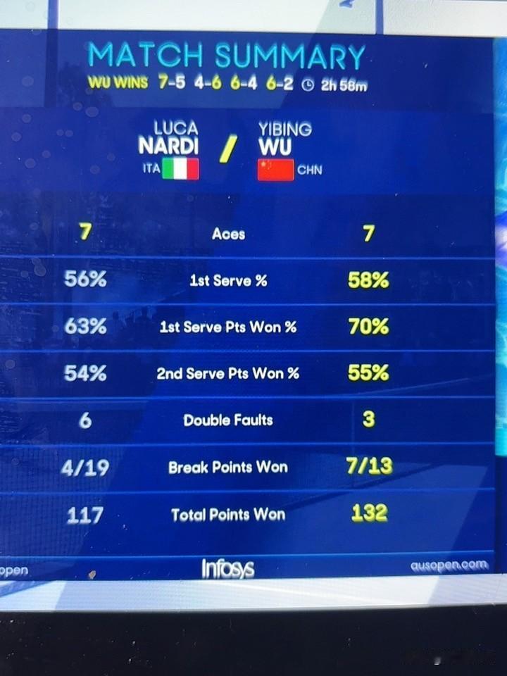 恭喜吴易昺闯入澳网男单次轮[比心][赞][赞][赞] 吴易昺太牛啦!恭喜他7 - 5、4 - 6、6 - 4、6 - 2战胜意大利纳尔迪晋级澳网男单次轮。 早在1月13日的澳网资格赛首轮,他就直落两盘7 - 5、6 - 4击败美国选手克鲁格。当时双方表现接近,都发了5记ACE球,克鲁格一发成功率略高,但吴易昺发球得分率76%高于对手的60%,得分更有效率。那次胜利让他收获8积分和5.7万澳元奖金。 如今又成功晋级次轮,期待他在后续比赛继续披荆斩棘,为中国网球创造更多惊喜!