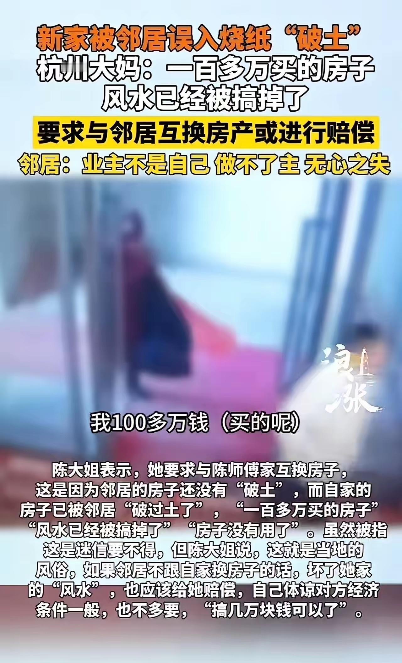 “太膈应人了!”浙江杭州,大妈去收新房,打开房门吓了一跳,里面竟然有一堆烧过的“元宝纸灰”!她毫不犹豫地选择报案,警方调查方向是隔壁邻居干的!大妈要求邻居赔偿几万,邻居却说自己走错了,有必要这样大动干戈吗? 这件事发生在杭州萧山,陈大姐刚拿到回迁房钥匙,满心欢喜去看新房。推开03房的房门,地上那堆黑灰和插着的小旗让她心里咯噔一下。好端端的新房,自己一天还没住,怎么就有人进来烧纸了?她立刻联系物业调监控。 监控画面显示,一男一女确实进过她家。警方介入后才弄清楚,原来是隔壁02房的陈师傅和他母亲。陈师傅家也分到了回迁房,正打算按当地风俗搞个“破土”仪式,祈求新房平安。不巧的是,物业委托的施工队维修后没把门关好,陈师傅母子误把03房当成了自己家,这才闹了乌龙。 陈大姐觉得特别晦气,在她看来,自家的新房被邻居“破过土”了,风水被破坏了,这房子“没用了”。她提出两个解决方案:要么两家互换房子,毕竟邻居的房子还没举行仪式;要么邻居赔偿几万元,算是弥补她心理上的损失。她觉得这个要价已经考虑到邻居经济条件一般,算是很体谅对方了。 邻居陈师傅表示自己并非故意闯错门,这完全是一场误会,是无心之过。他还提到,房子真正的业主并非他本人,换房这种事他做不了主。面对陈大姐的赔偿要求,他难以接受,认为没必要为一场误会“大动干戈”。 事情传开后,有人理解陈大姐对风水的讲究,觉得新房还没住就发生这种事确实心里别扭。也有人认为这纯属迷信,邻居既然是无心之过,好好沟通就行,没必要上升到赔偿换房的地步。 目前,当地村委已经介入协调,希望能帮助两家人找到一个都能接受的解决方案。我们在新房交接、维修期间,物业和业主都需要多份细心,锁好门,确认清楚,避免类似让人“膈应”的误会发生。 各位读者你们怎么看?欢迎在评论区讨论。
