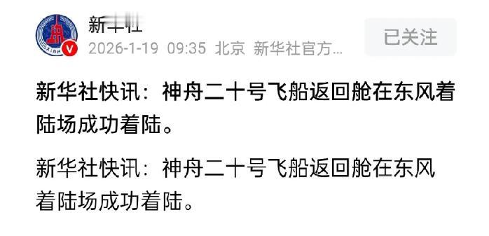 神舟二十号飞船回来了!根据新华网报道,1月19日早晨,神舟二十号飞船返回舱,已经