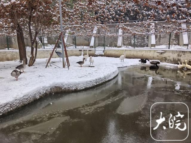 大皖新闻记者随后来到白天鹅、黑天鹅、大雁等动物的生活区域,这些不怕冷的动物正悠闲自在地在水池边踱步。“我们在下雪前就为动物们准备了充足的口粮,饿不着。对怕冷的动物,提前做好防护。对这些不怕冷的动物,只要按时喂养就行了。”罗园长介绍说。