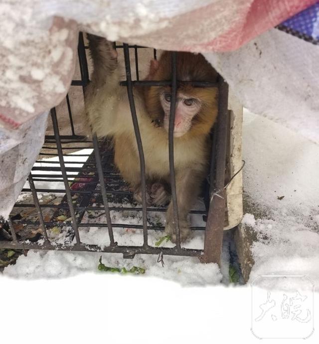 小猕猴所在的露天笼舍也被一层防雨布裹得严严实实,园长罗树堂抓来一把吃的,喊了一句,笼舍里的小猕猴就一把掀开防雨布,伸出爪子拿走食物,吃过后再掀开一个口子,警惕地看向外面。