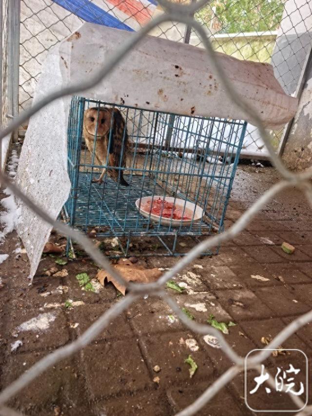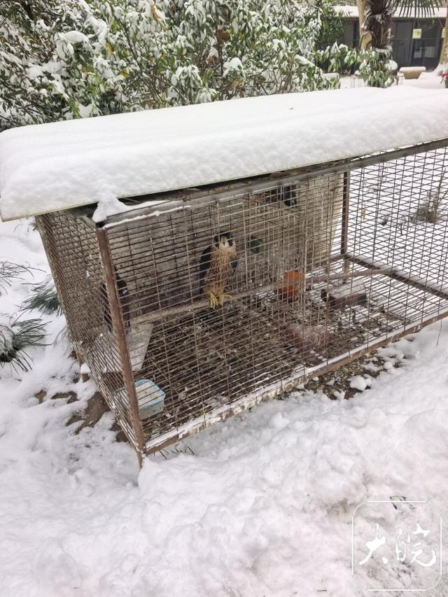 大皖新闻记者在该动物园里看到,去年12月被救助的小猴面鹰所住的笼舍上已被盖上了一层毯子,外部棚顶上还铺设了防雨布,这样雪花就落不到小猴面鹰身上。记者从侧面看到,笼舍里放着一盘没有吃完的食物,小猴面鹰正呆萌地看向笼子外面。