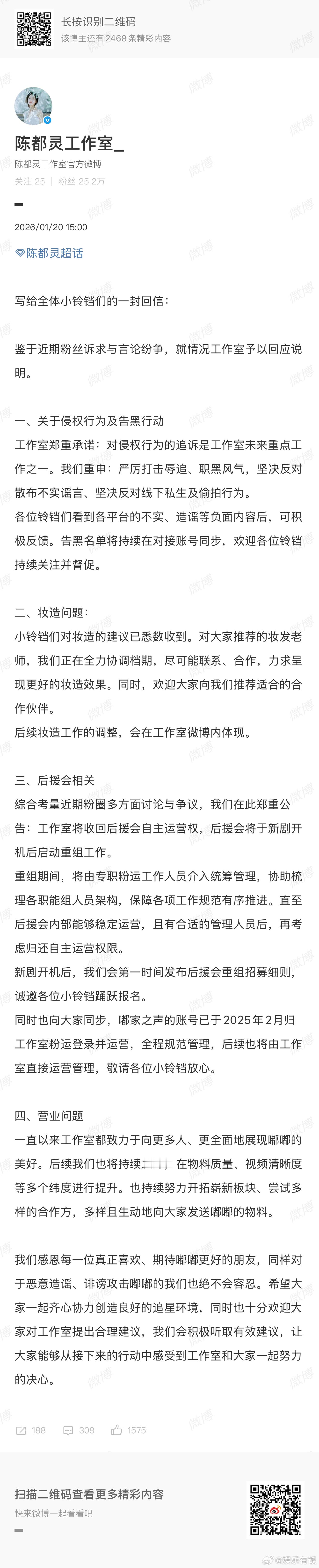 陈都灵工作室给小铃铛的回信 陈都灵工作室发文回应粉丝诉求,对于告黑、妆造、营业、后援会多个事项进行详细回复,也欢迎大家提出合理建议,并且倡导和粉丝一起协力创造良好追星环境,工作室写的很真诚,也很用心了。陈都灵工作室回应争议