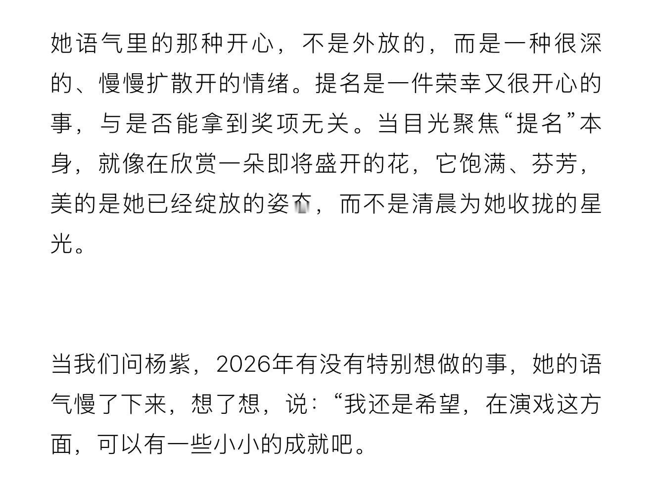 天啦噜我紫的Glass杂志采访里提到2025年最开心的一件事是获得白玉兰提名,2026年特别想做的是:“我还是希望,在演戏这方面,可以有一些小小的成就吧。”