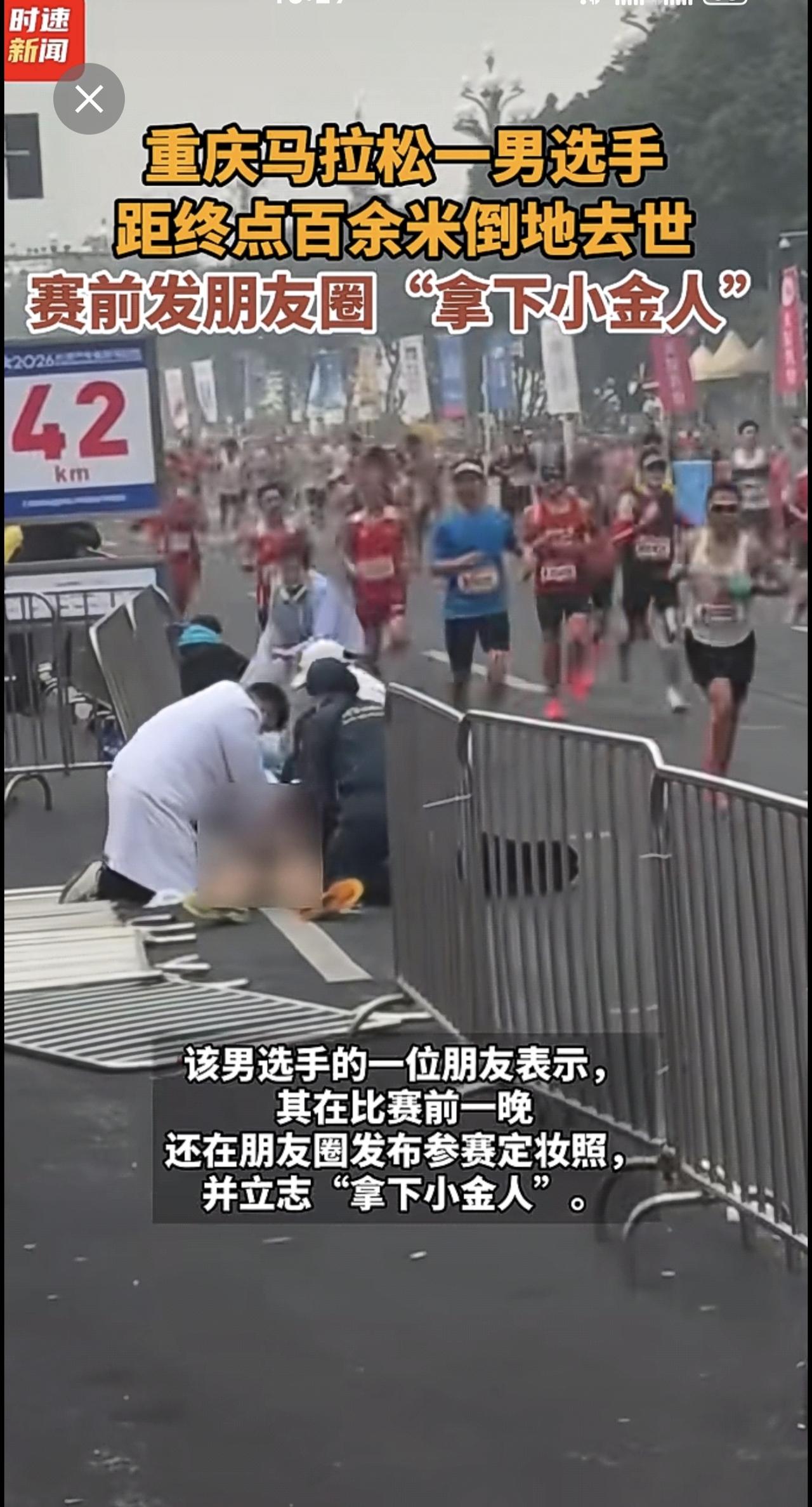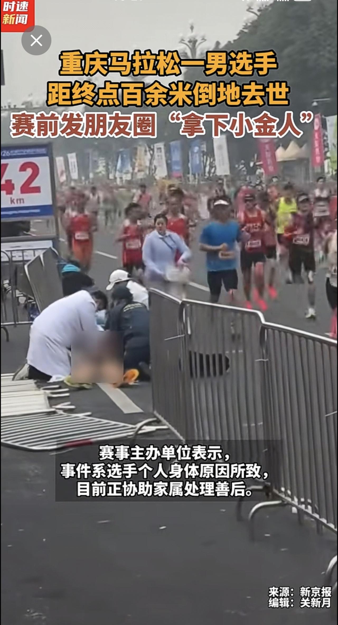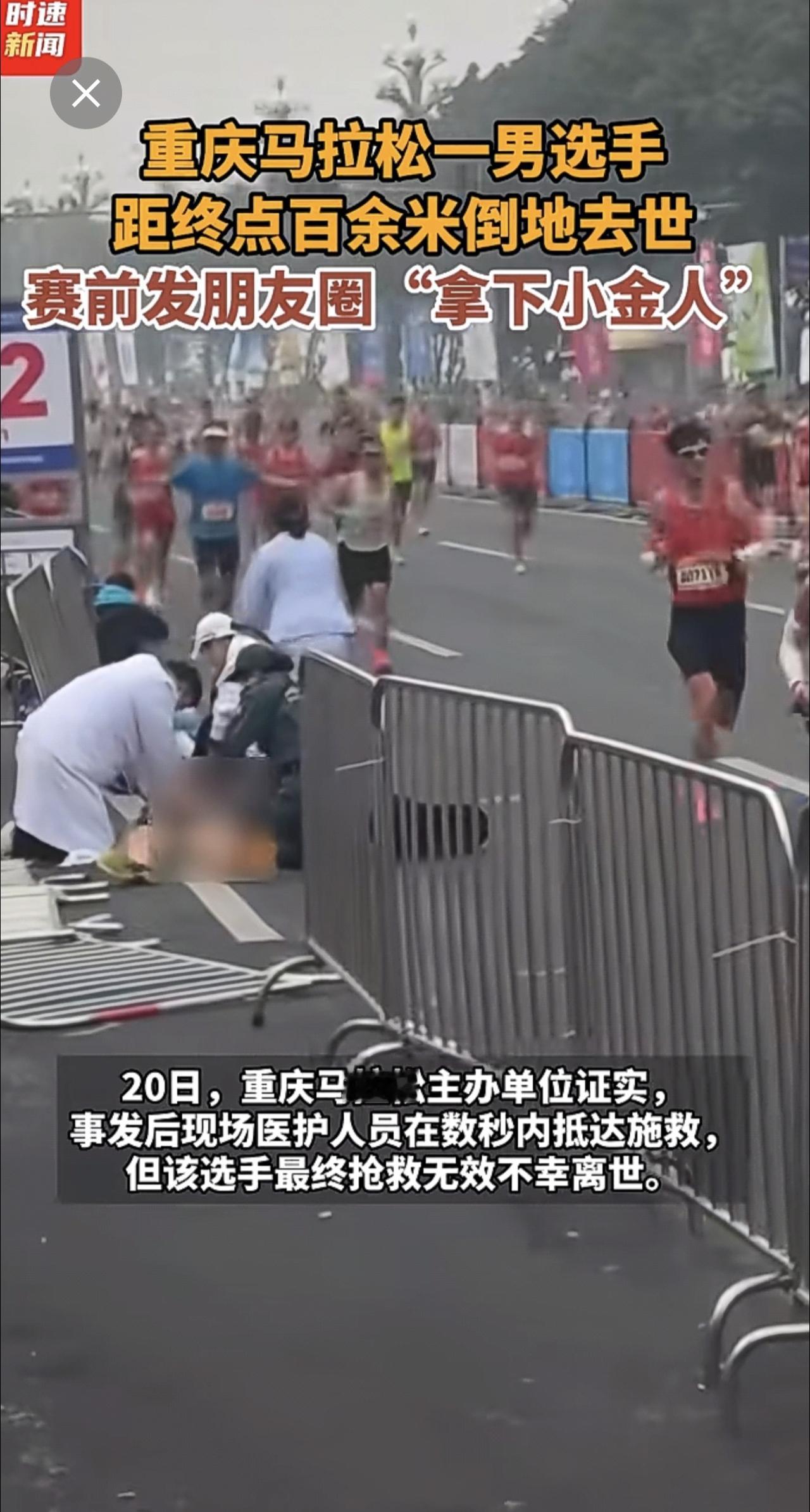 重庆马拉松一男选手距终点百余米倒地去世,赛前发朋友圈“拿下小金人”