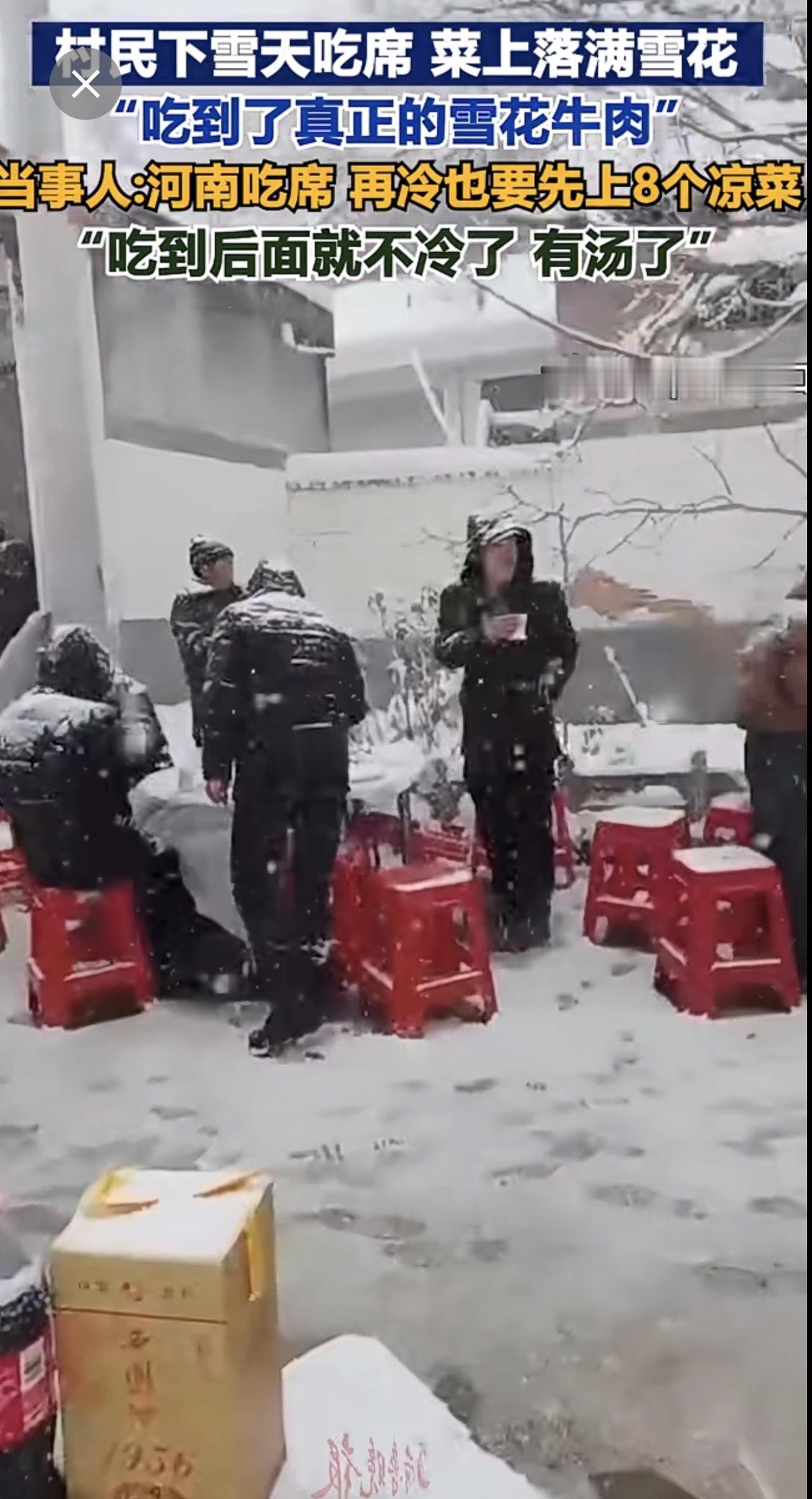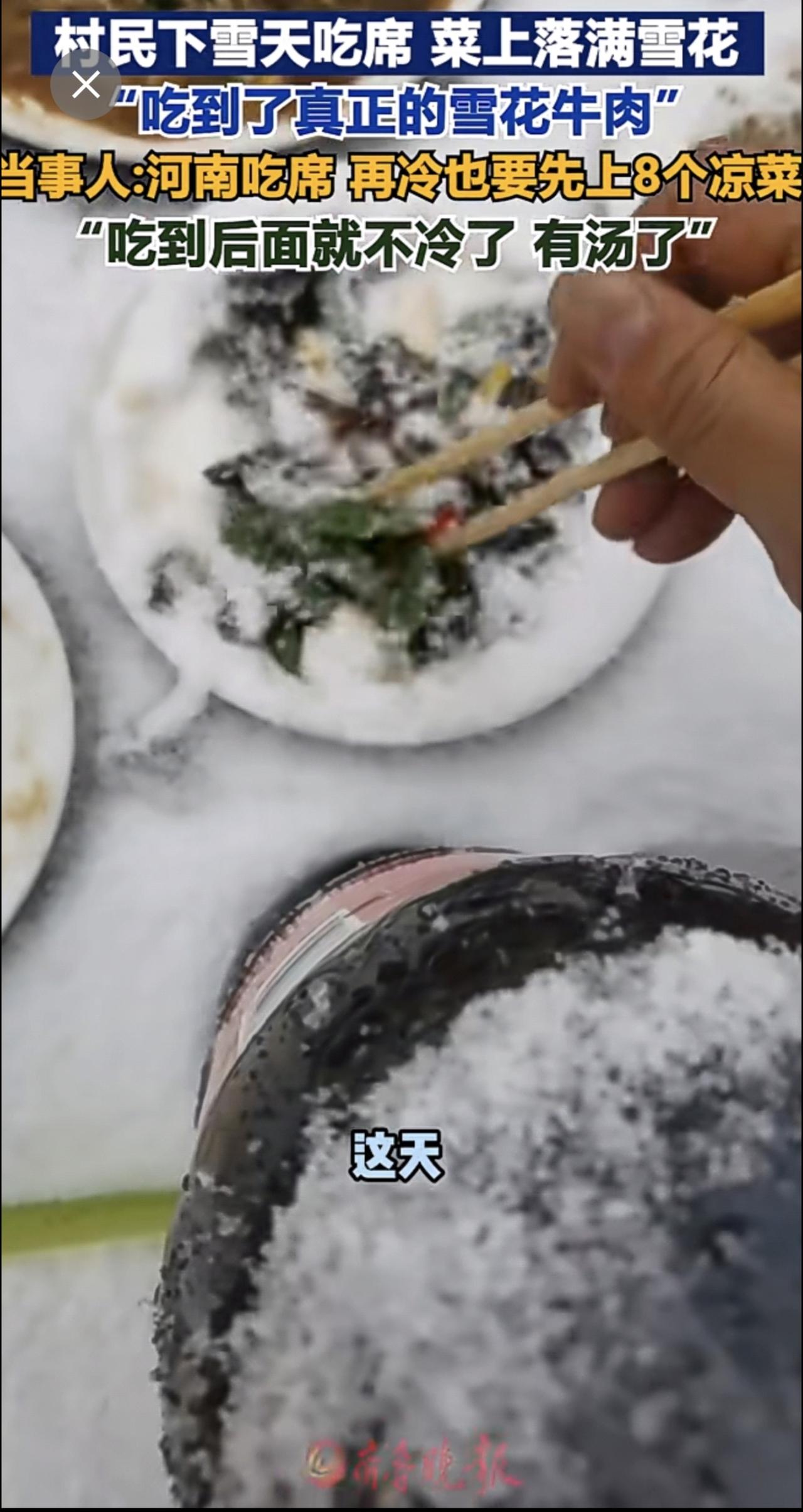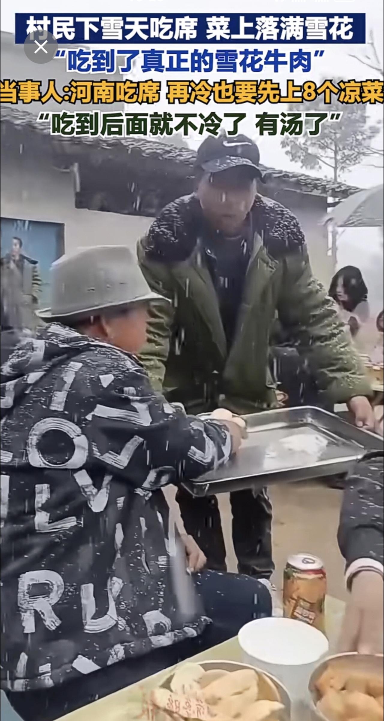 村民下雪天吃席 菜上落满雪花“吃到了真正的雪花牛肉”当事人:河南吃席 再冷也要先