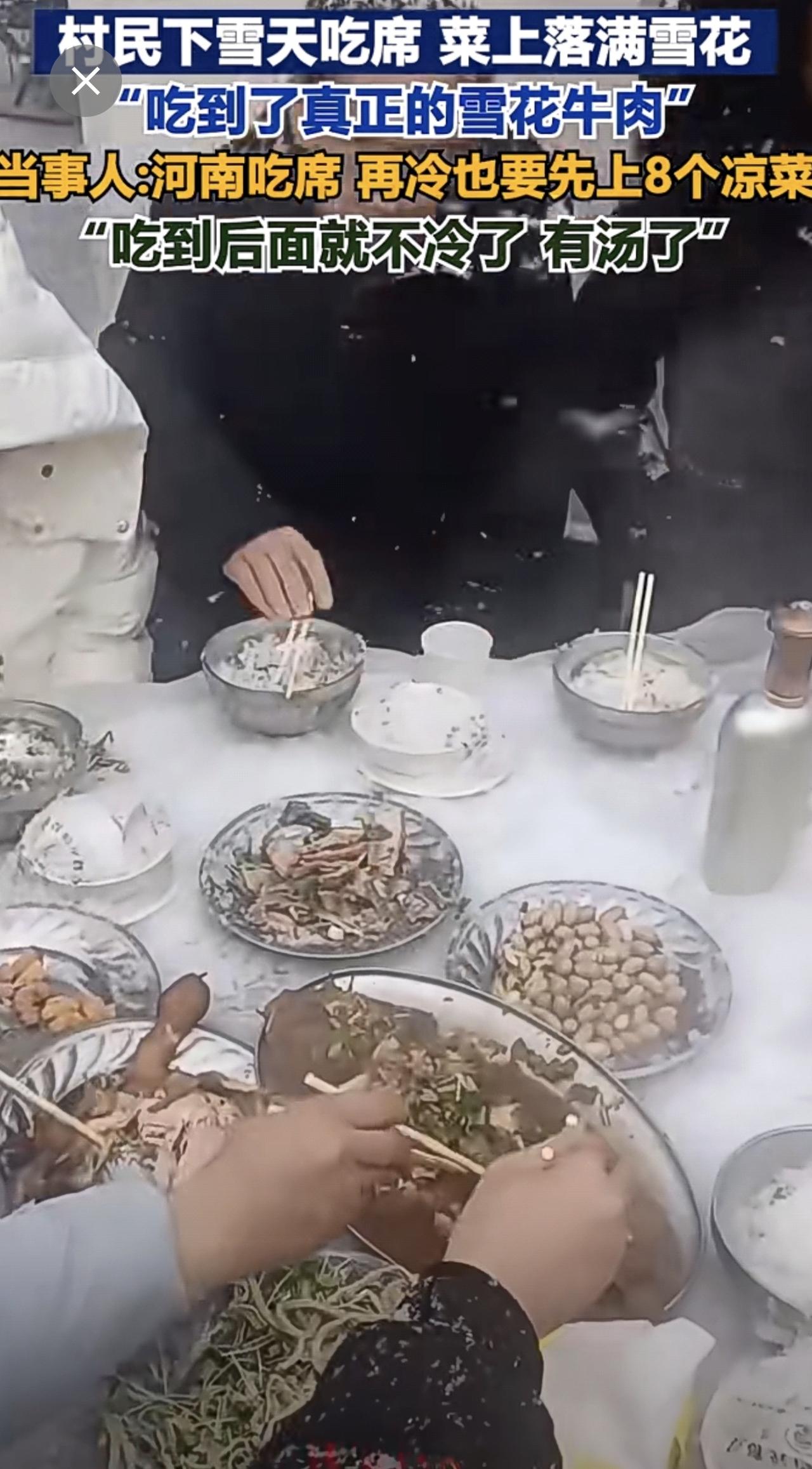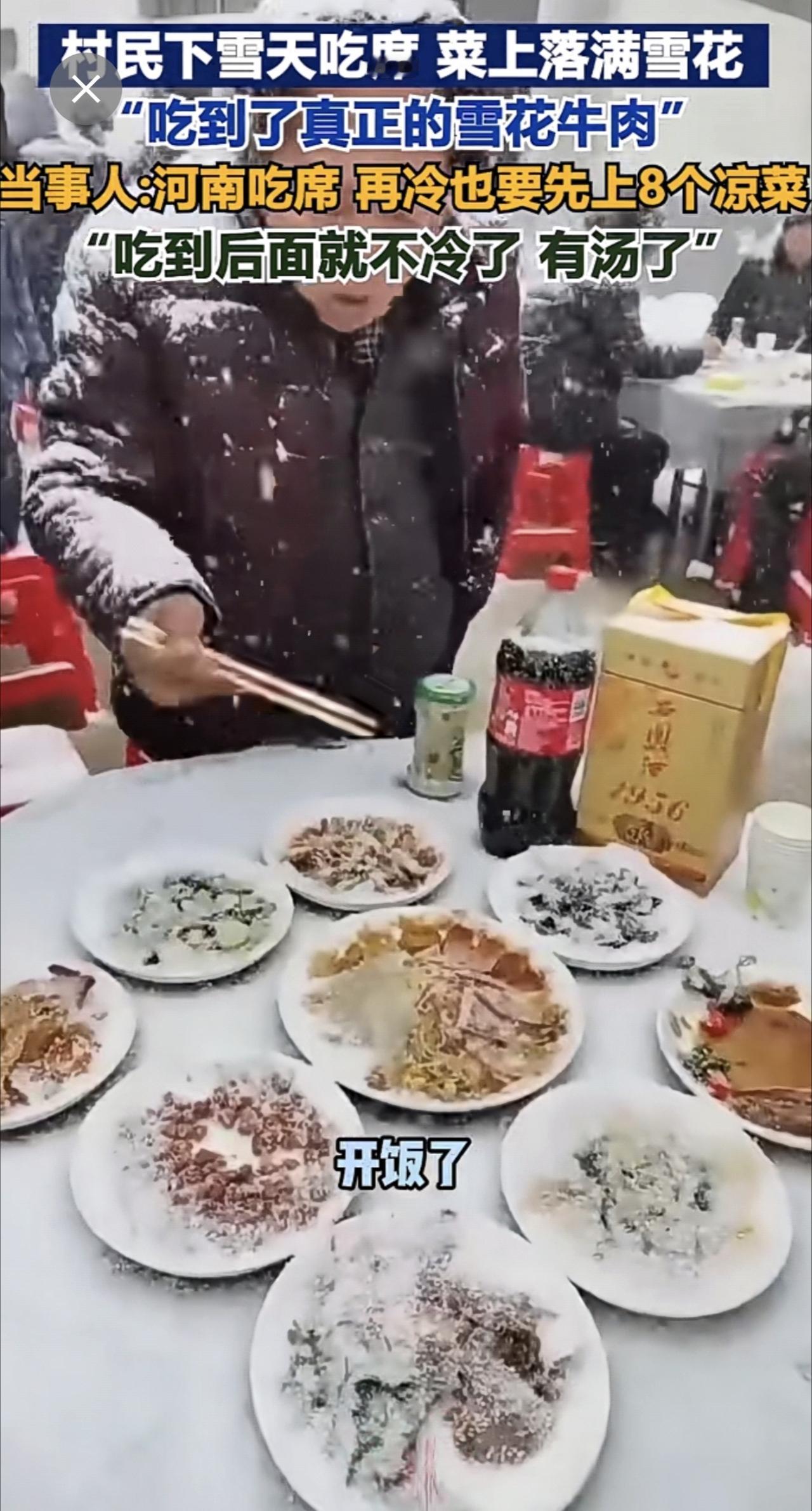 村民下雪天吃席 菜上落满雪花“吃到了真正的雪花牛肉”当事人:河南吃席 再冷也要先上8个凉菜(九派新闻)